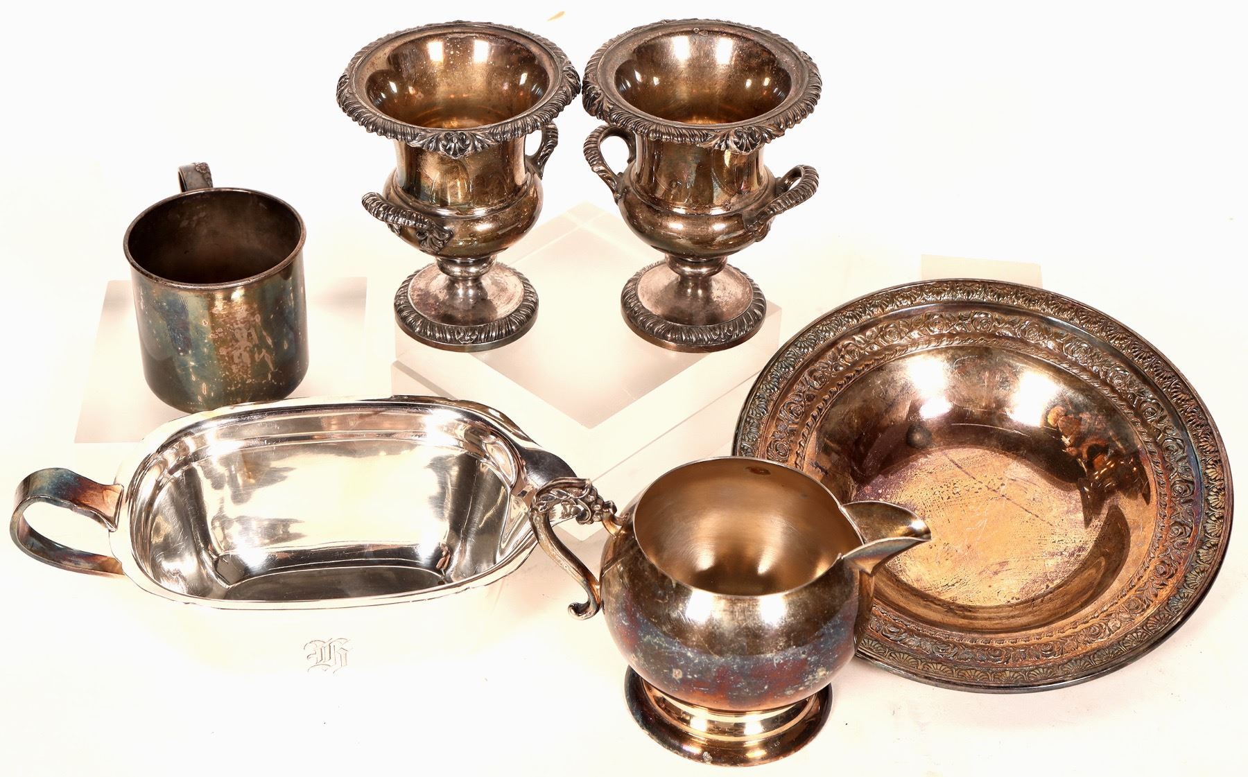 14 smaller silver plate pieces, largest is gravy boat, 2x4x7". 8x 2.75" coasters with glass substrate condition issues but have good top appearance, 2x dual handled cups, 1 single handle cup, creamer, 6.5" plate. See photo.