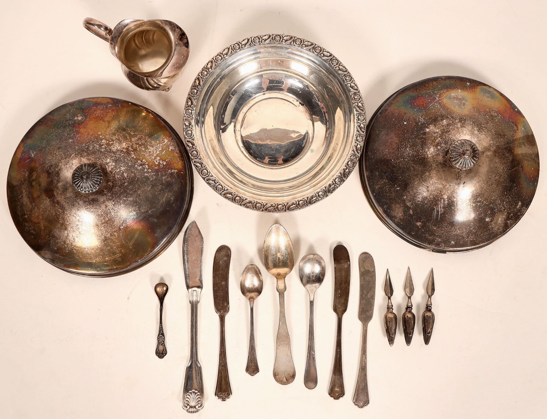 Assortment of silver plate. Lid, creamer, bowl, 3 spoons, 4 knives, 2 corn holders.