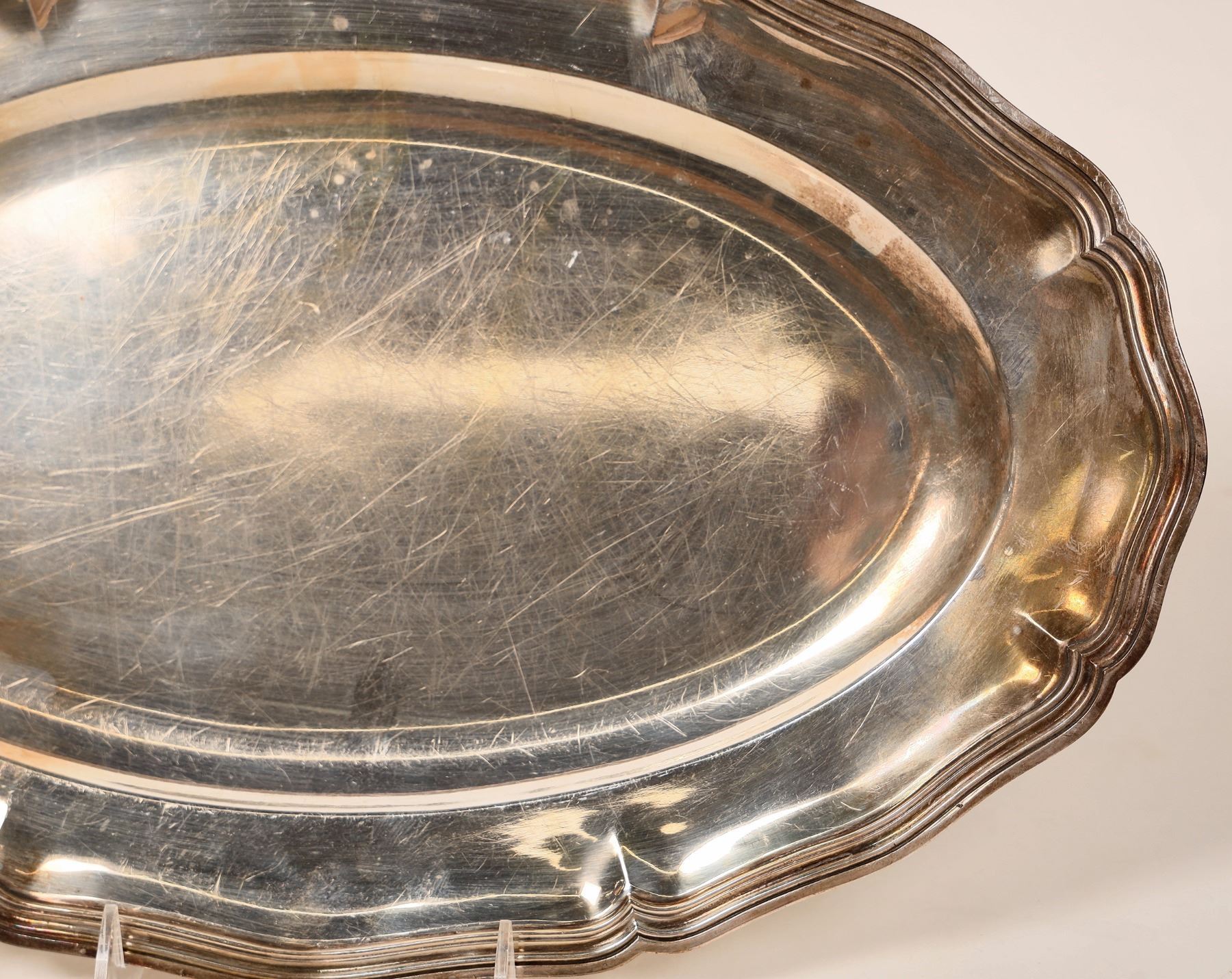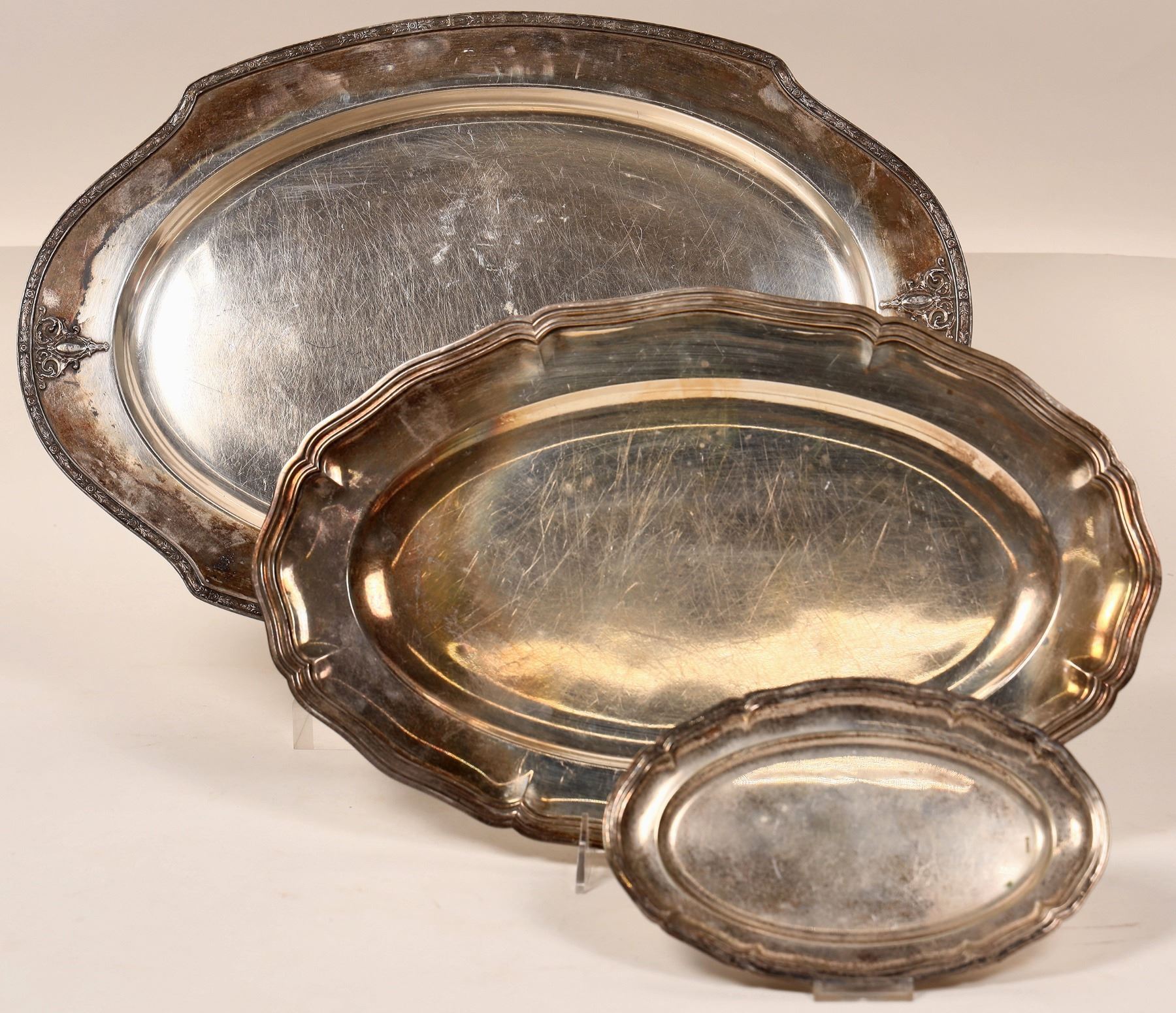 3 silver plate serving platters. 8.5x5.5", 14.5x16", 18.75x13".