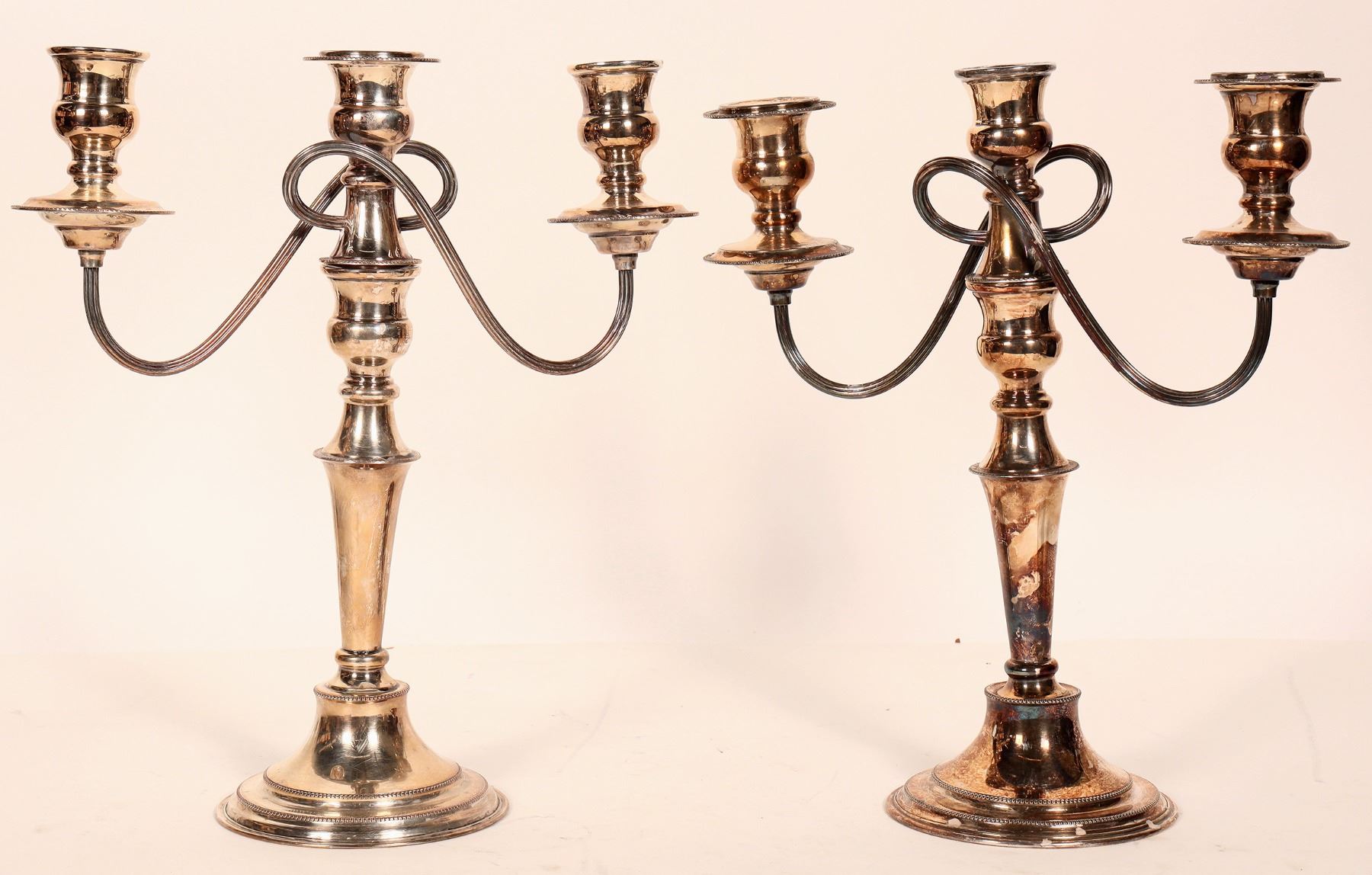 Pair of silver plate triple candelabras with 2 snuffers, 14.25x12.5".
