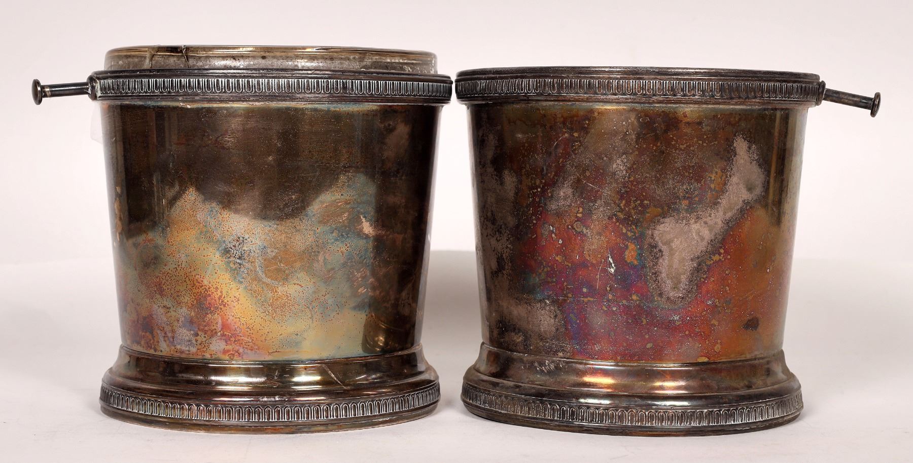 Pair of vintage silver plate small Champagne buckets. 7x7". 1 has broken glass insert, the other has no insert but signs of use. Sold as is.