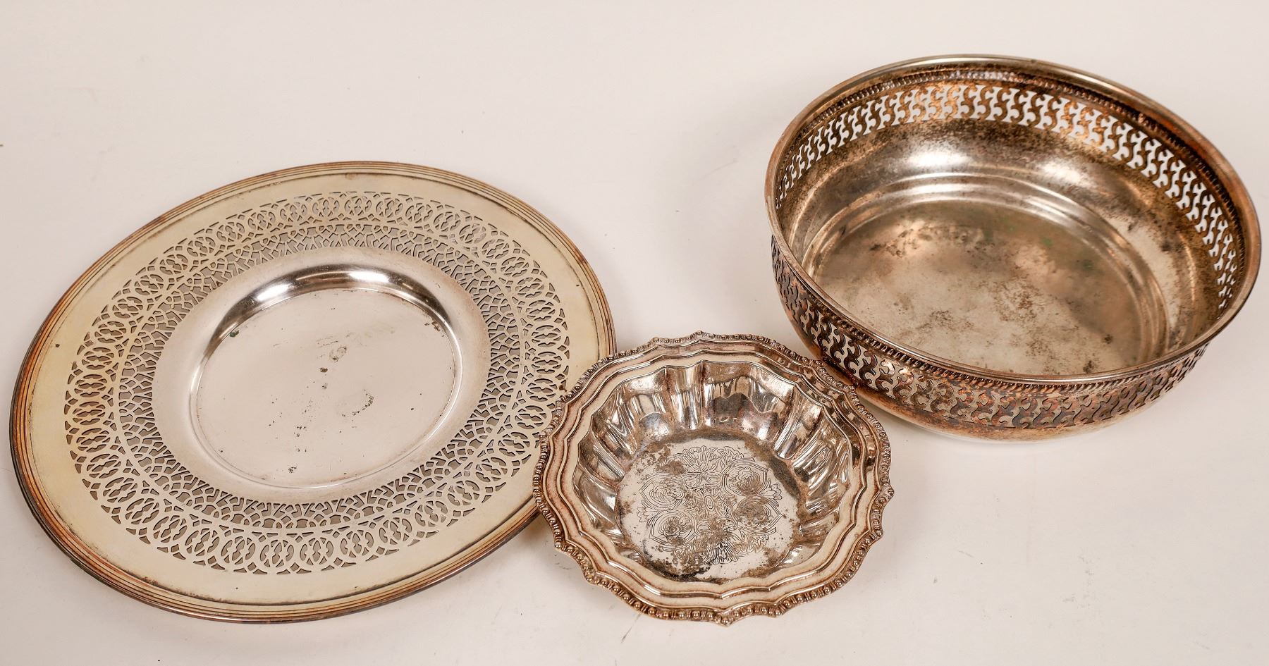 Group of three silver plated vintage serving ware, circa early 1900s. Includes: Silver plated candy dish, maker's mark Avon/HMC/Silverplate/Italy, ornate scalloped edges with engraved design, 6" diameter; Wm. A Rogers bowl with pierced design with rope edging, 8.25" diameter; and Royal Rochester Sheffield round tray with pierced edging, 10.75" diameter, maker's mark and the number 3470S on bottom. All in good to excellent condition.