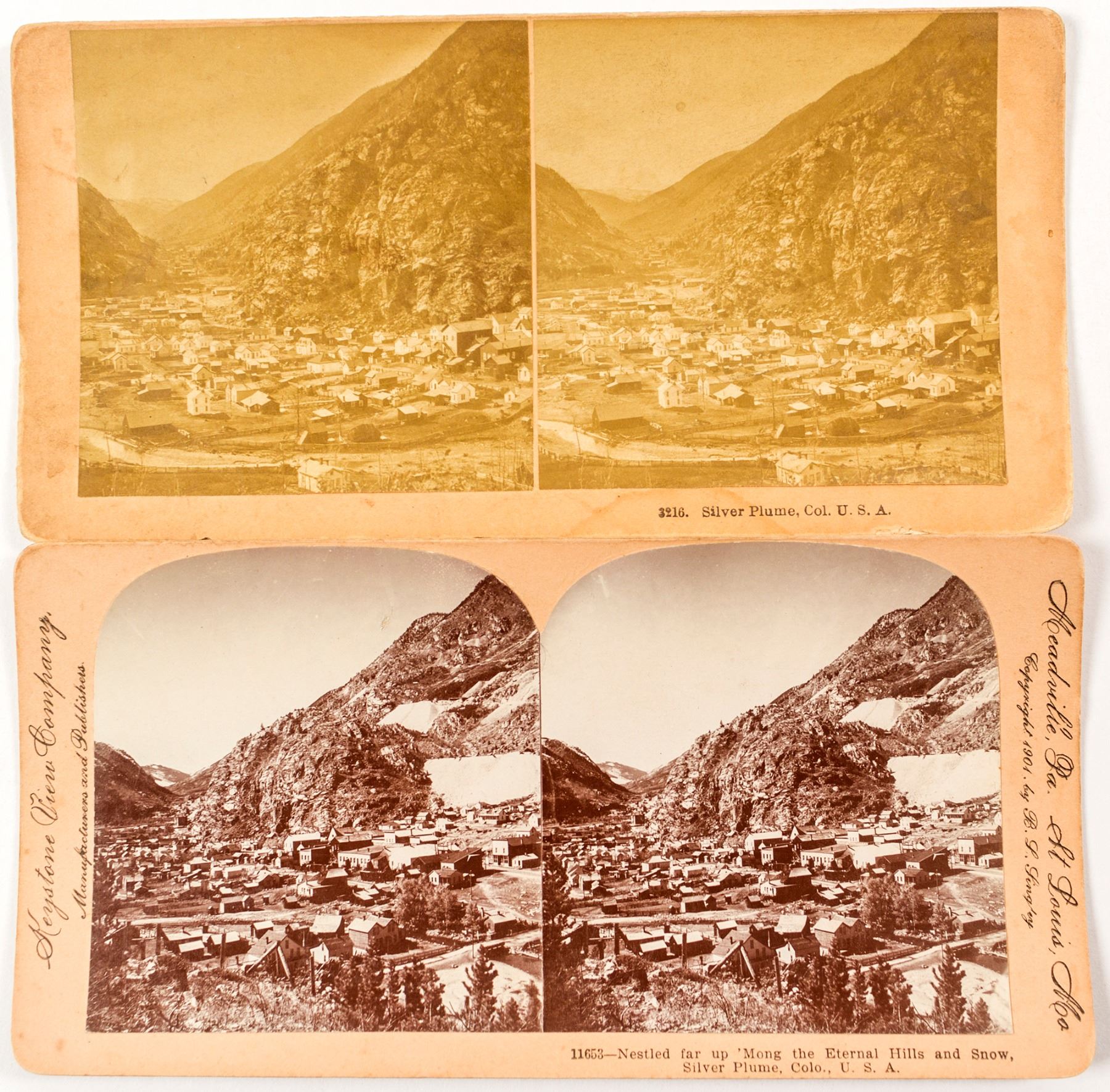 2 stereoviews of Silver Plume by Kilburn Bros. and Keystone. Contrast is deep on one.