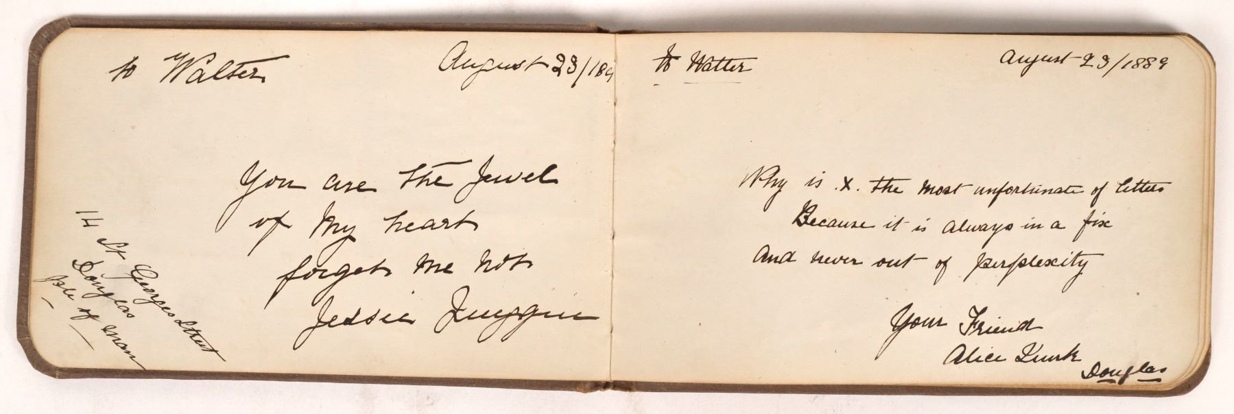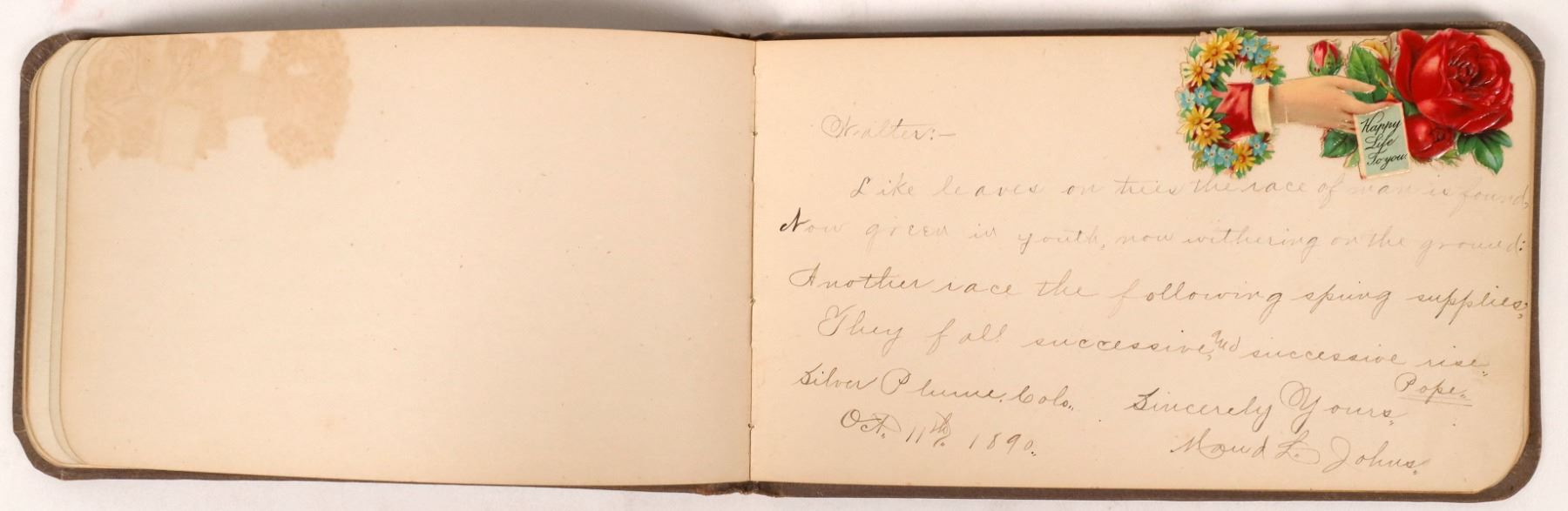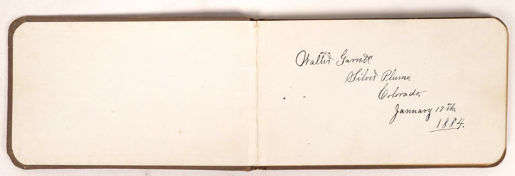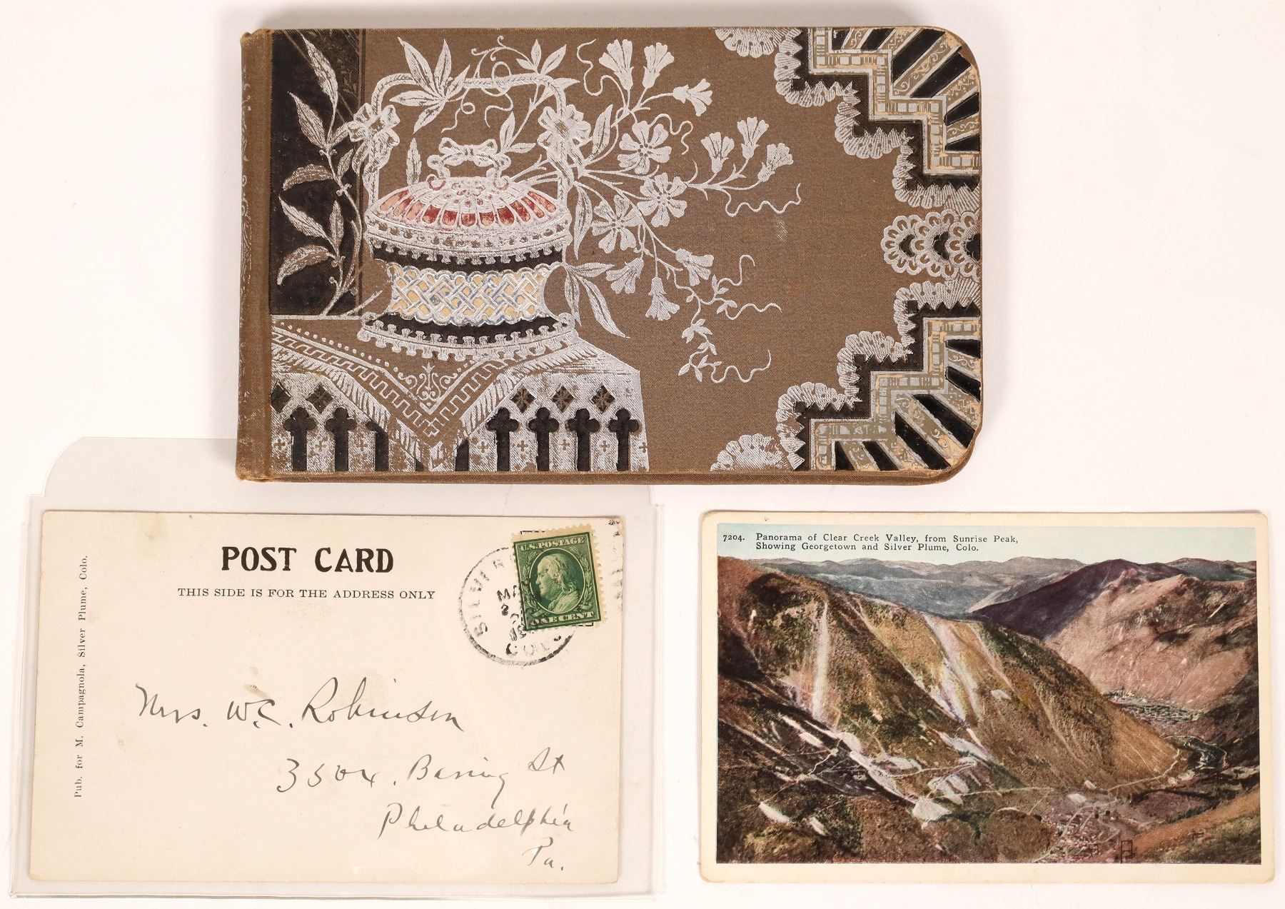 Lot of three. Two postcards: Silver Plume overview (pub. By Campagnola) and distant canyon view. Silver Plume autograph book is half full. Dated 1884 to 1890.
