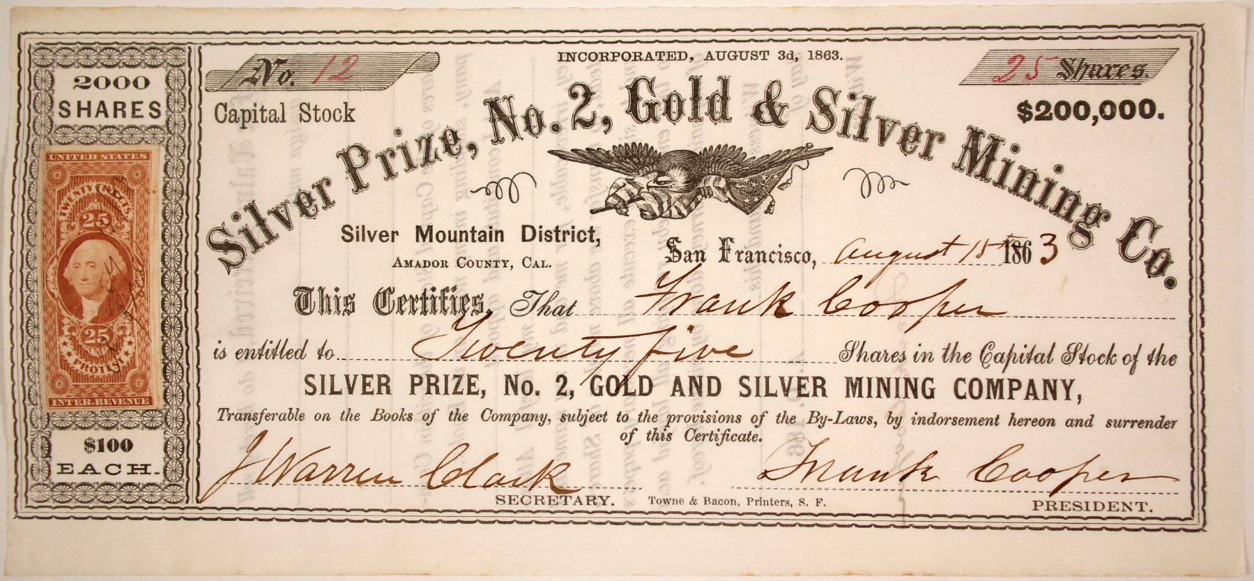 Very early number 12 for 25 shares to Frank Cooper. Datelined San Francisco 1863. Signed by secretary J Warren Clark and president Frank Cooper. Incorporated August 3d, 1863. 25c Protest Revenue Stamp. Not cancelled. Location, "Silver Mountain District, Amador County, Cal." Towne & Bacon printers. The Silver Prize was located on range with Mountain and Silver Creek Companies. Frank Cooper was one of the original Commissioners charged with designating the election precincts in newly-formed Alpine Co. (1864 "Alpine County Bill"; see 1864 Aug 11; see also Board of Supervisors Minutes, Book "A", page 1; and see text of “Alpine County Bill” printed in 1864 July 30 MG). J. Warren Clark was also secretary of the El Dorado Gold & Silver, Silver Prize G&S, Mammoth G&S, Napa G&S, George Washington G&S, etc. [Thank you to Karen Dustman, local historian and author of the book "Silver Mountain City (Clairitage Press) for background information on the mine and signatures.] Prag Collection City: Silver Mountain District, Amador County State: California Date: 1863 HWAC# 79729