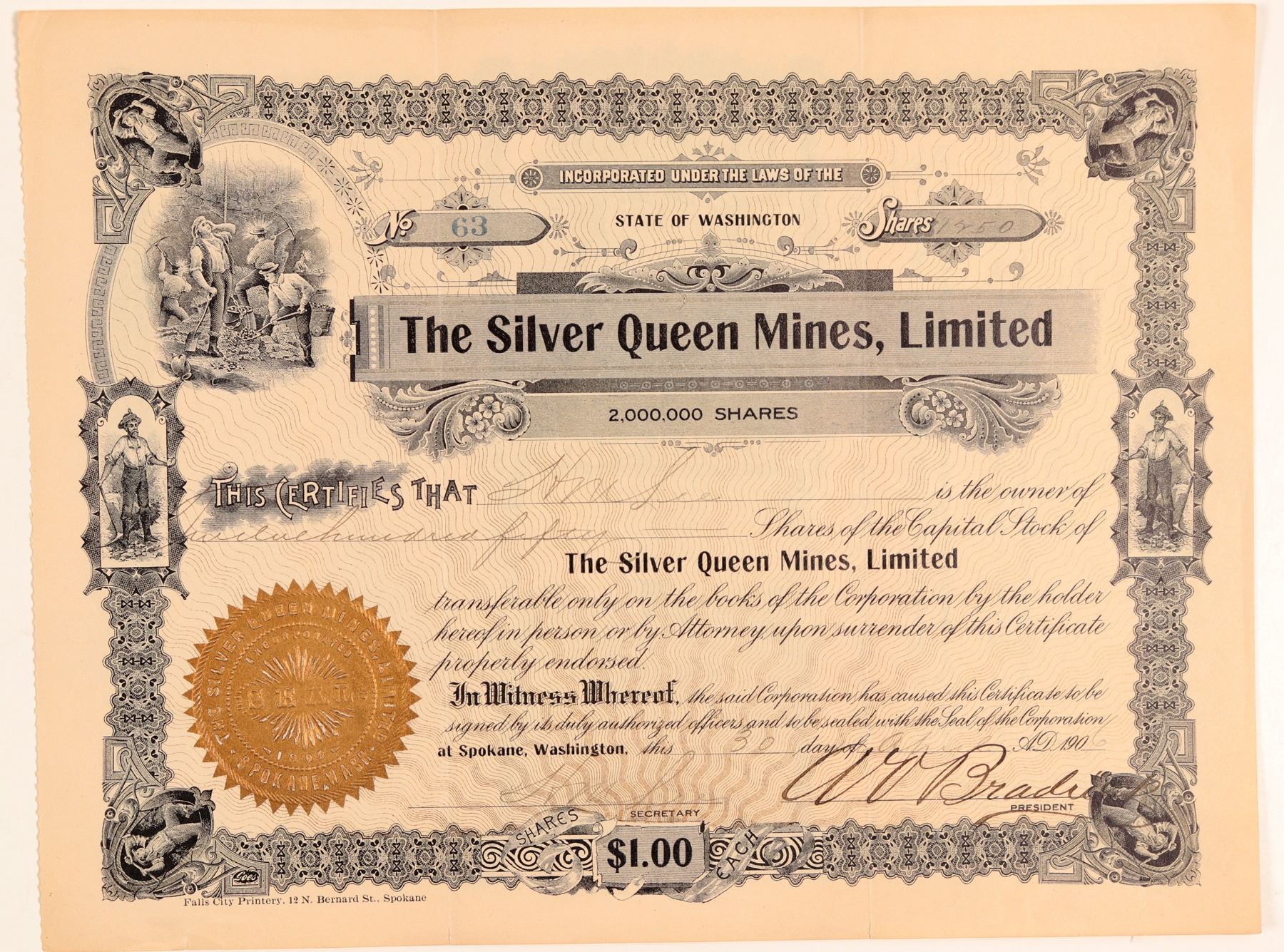 # 63 for 1,250 shares to Lee. Signed by Lee as secretary and Brad(?) as president. Dateline 1906. Incorporated 1905. Not cancelled. Black on brown safety paper. Fall City Printery of Spokane as printer. Seven stock mining vignettes. Top left corner has small folds. Fold edges are heavy. OVer all very nice! Probably a Canadian - Yukon Stock. Ken Prag Collection