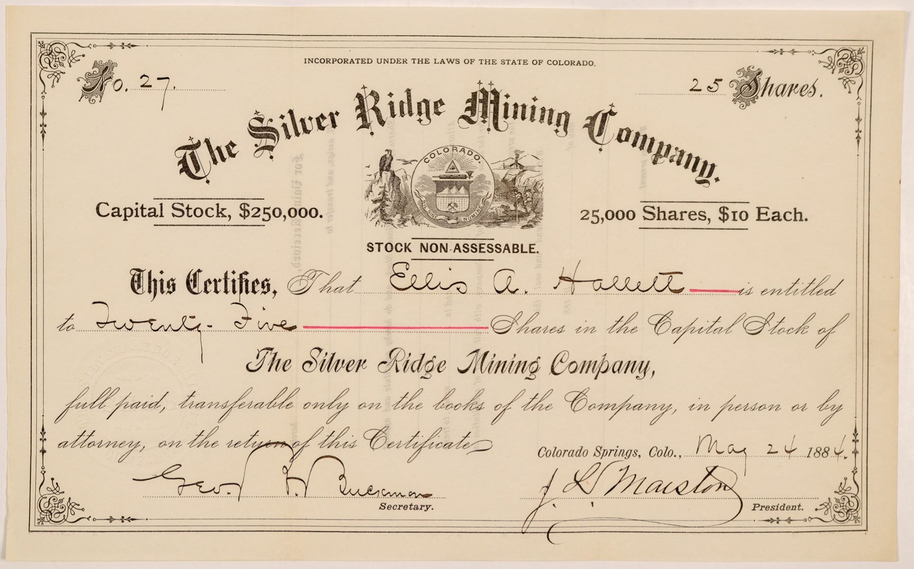 Inc. in Colorado. No. 27, issued for 25 shares to Ellis A. Hallett in Colorado Springs on May 24, 1884. Signed by president J.L. Maiston and the secretary. Not cancelled. Simple design with black border and print, Colorado state seal vignette. Folds, light wear. 6.5 x 10.5" Not listed in C&L. One reference found in an article in the Salida Mail newspaper, June 28, 1884: the company owns the Fourth of July claim on Treasury Mountain in Gunnison County and have recently hired a superintendent. Ken Prag Collection