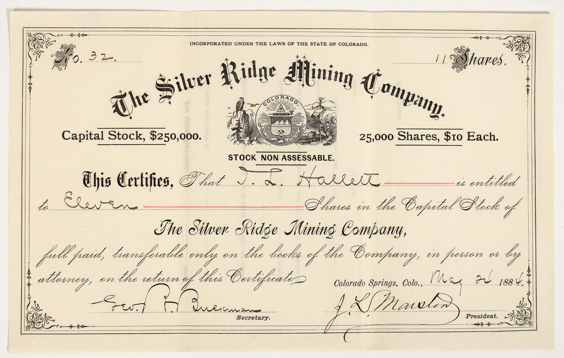 Inc. in Colorado. No. 32, issued for 11 shares in 1884 in Colorado Springs. Signed by president JL Marston and the secretary. Not cancelled. Black border and print, Colorado state seal vignette. Folds, clean. 6.5 x 10.5" Not listed in C&L. One reference found in an article in the Salida Mail newspaper, June 28, 1884: the company owns the Fourth of July claim on Treasury Mountain in Gunnison County and have recently hired a superintendent.