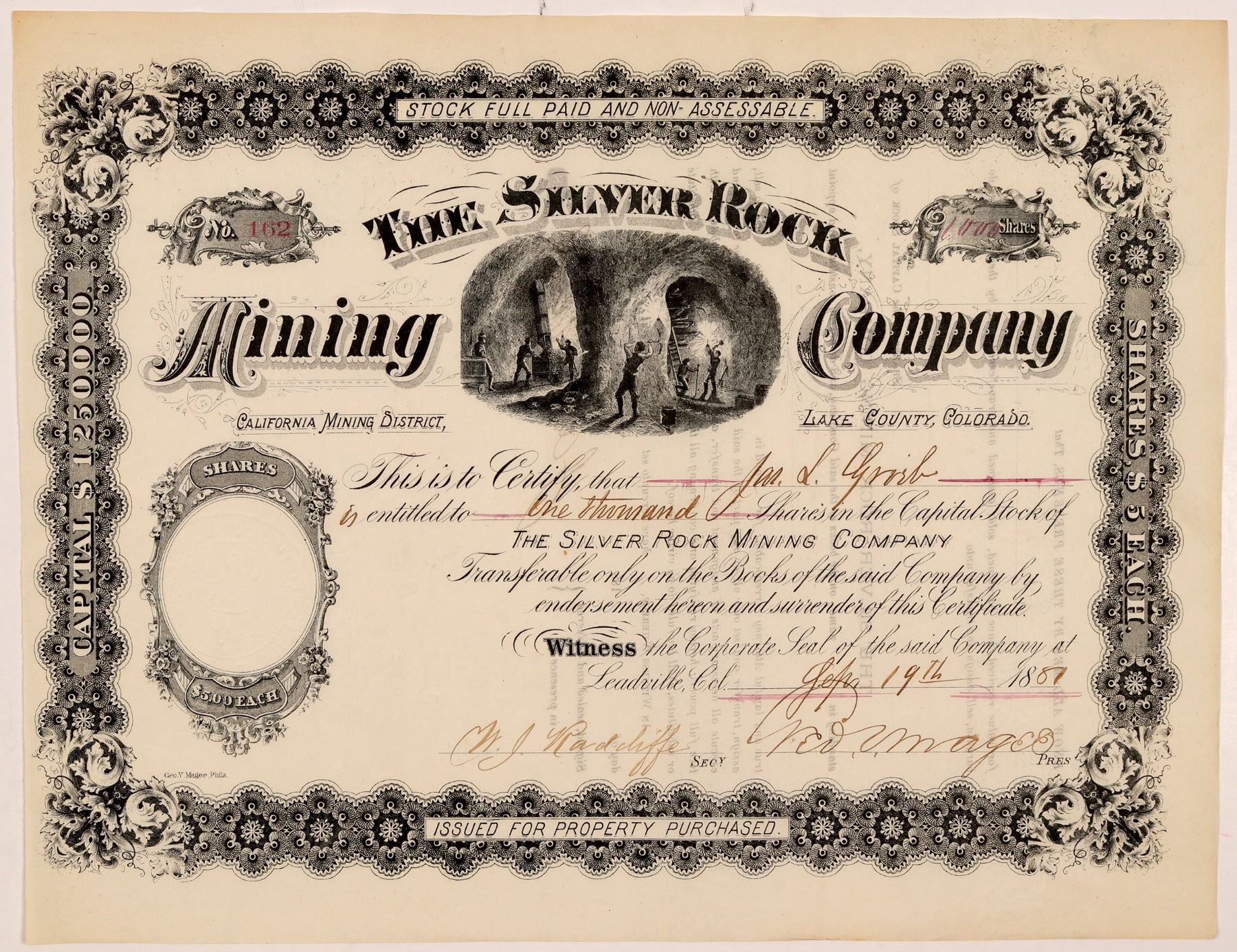 "California Mining District, Lake County, Colorado" (printed under title). No. 162, issued for 1,000 shares to Jas. L. Groeb on Sept. 19th, 1881 in Leadville. Signed by president Geo. V. Magee and secretary W.J. Radcliffe. Not cancelled. Ornate design with black border and print, underground mining vignette. Printed by Geo. V. Magee, Philadelphia. Rare that the engraver is also the company president! Folds, wrinkles. 9 x 11.75" Not in C&L. No references found. Ken Prag Collection