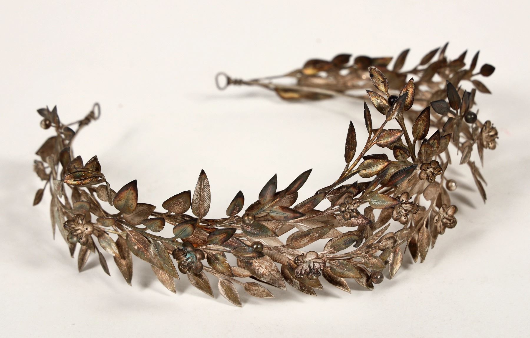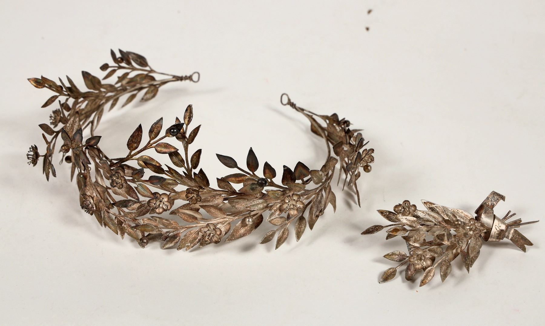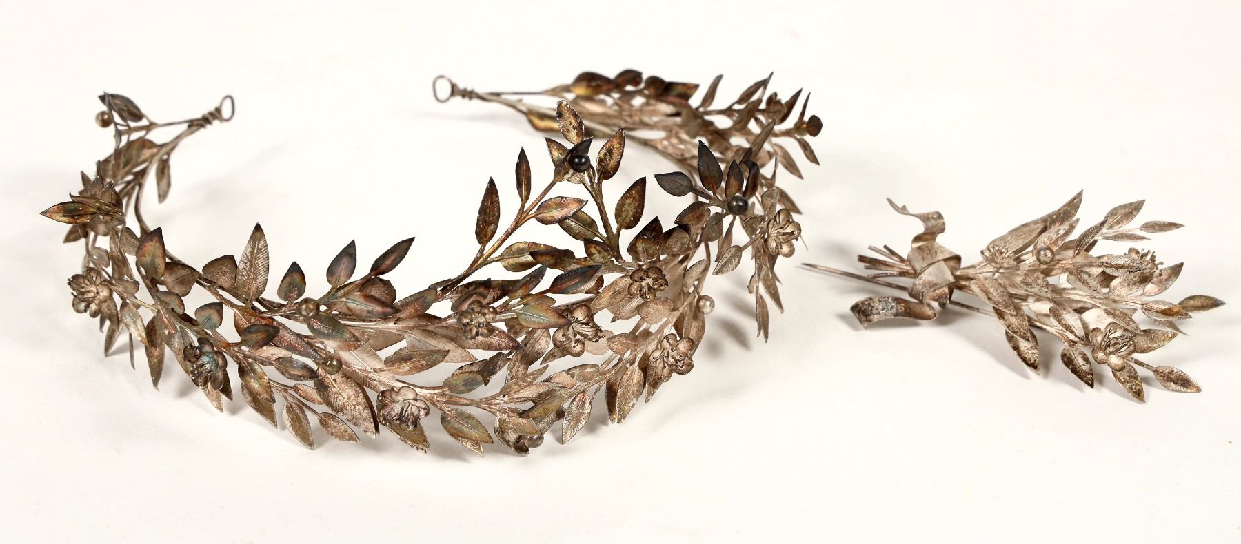 A matching silver tiara and brooch, both dating c. 1907. The tiara is crafted to look like a Roman-style laurel wreath, with dozens of tiny leaves as well as delicate silver flowers and laurel berries (about 7.5"x6"). The matching brooch is made up of several silver laurel sprigs bound together by a waving silver ribbon that reads "1882 / 12 Oct. / 1907" (about 4" long). These pieces are a phenomenal example of Art Nouveau jewelry craftsmanship; this style drew heavily from natural botanical forms as well as the classical societies of Greece and Rome, and this influence is fully on display in these spectacularly detailed and delicate items. Both have some notable tarnish due to their age, and would need some polishing to return them to their former glory. See photos.This fabulous Tierra is from the collection of noted archaeologist Rudolf Ludwig Friedrich Herzog (b1871-d1953). He was an important archaeologist and lifelong student of the history and science of medicine. His father, Ernst Herzog (1834-1911), was a professor in Tübingen. He received his doctorate in 1894. As an advanced student, he received a travel grant from the German Archaeological Institute in 1897, which allowed him to travel to ancient sites in the Mediterranean, particularly to the island of Kos. After completing his internship, he became a lecturer in 1899 and an associate professor in 1903. In 1902, with the help of Jakob Zarraptis, he discovered the Asclepius sanctuary of Kos, which has become known as the birthplace of medicine in the ancient world.