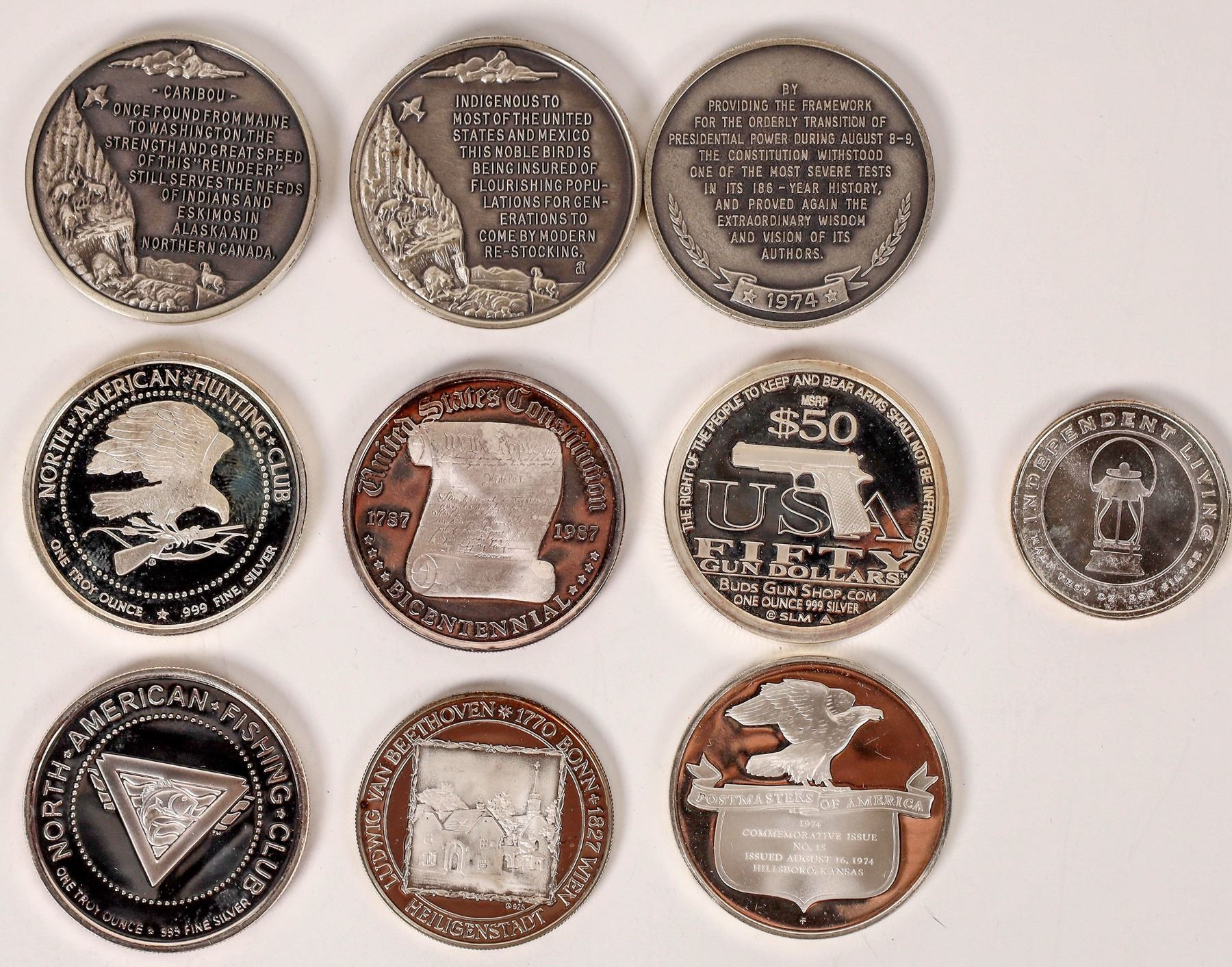 Lot of ten silver rounds: Ludwig Van Beethoven; Founding Fathers; U. S. Constitution; Postmasters of America; Wild Turkey; Caribou; North American Hunting Club; Fifty Gun Dollars; Paul Revere's ride (1/2 ounce). The other nine are one ounce.