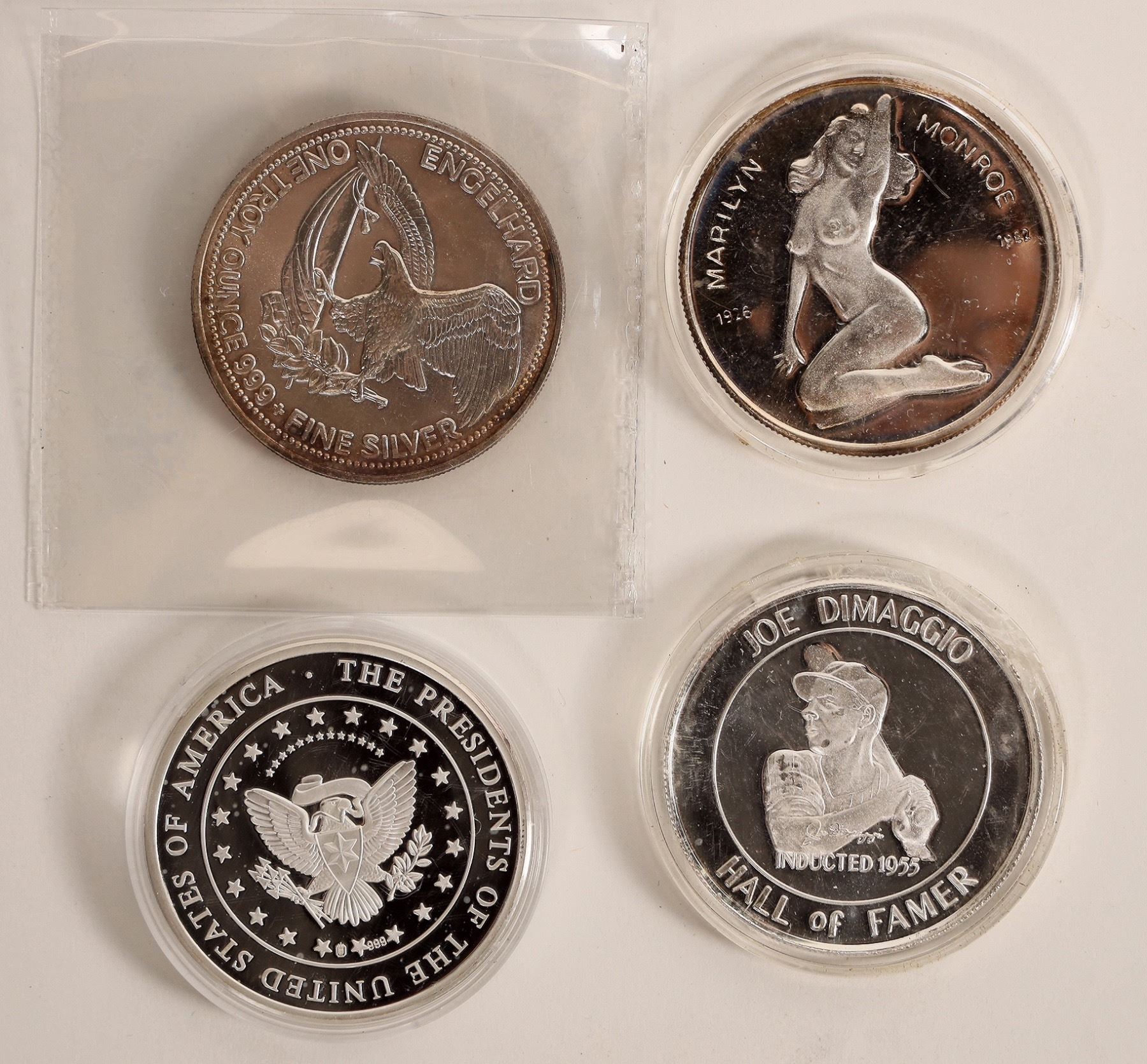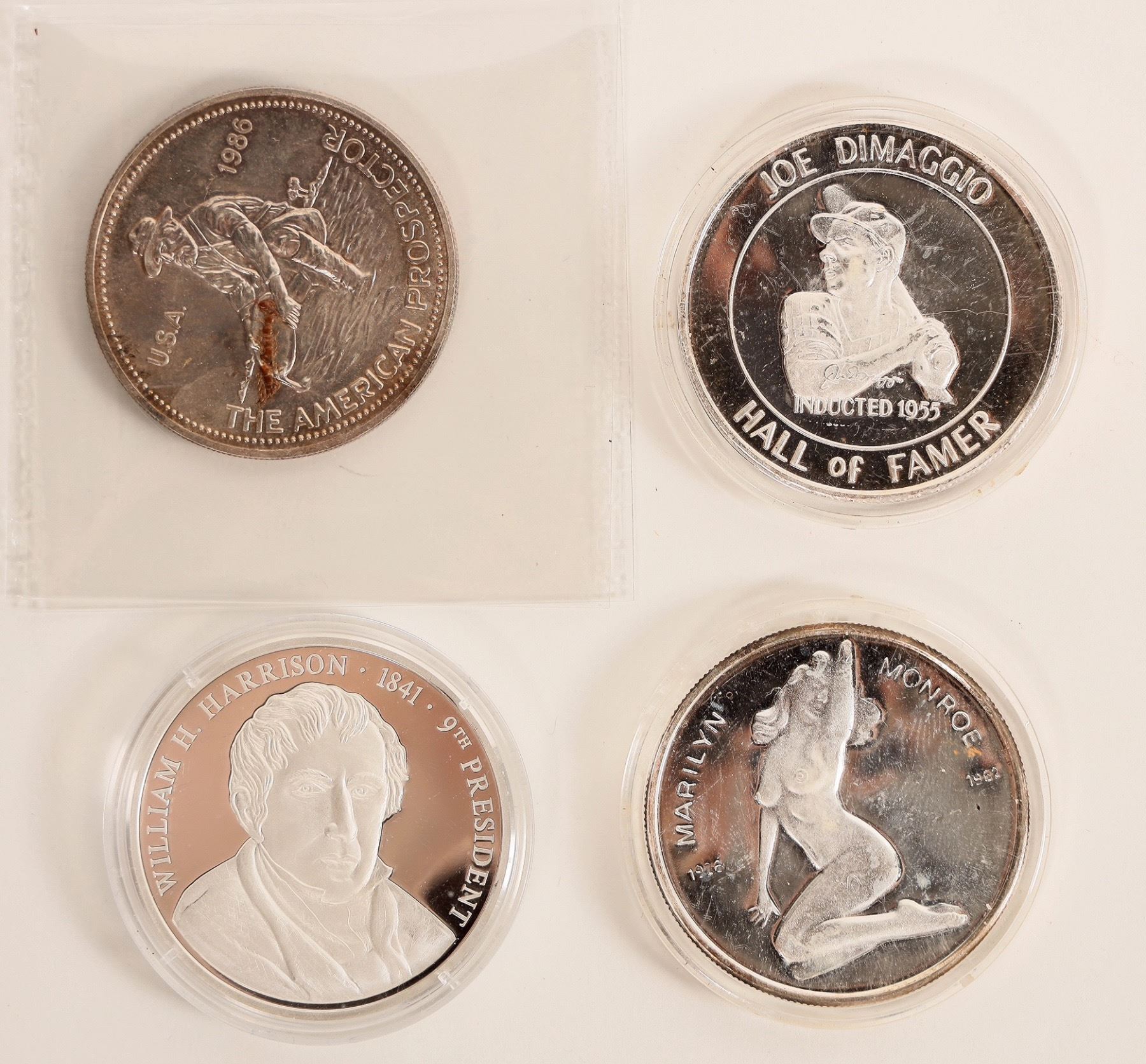 Four one ounce silver rounds: The American Prospector by Engelhard. Stamped one ounce .999 fine silver. The other three are not marked as silver, but believed to be: William H. Harrison; Joe Di Maggio/Marilyn Monroe (2).[