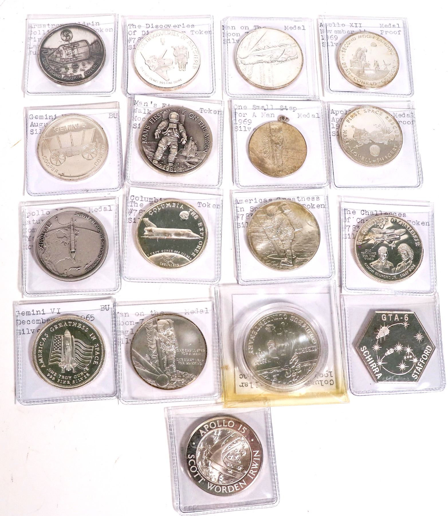 Lot of seventeen silver medal commemorating space exploration, mostly one ounce. Apollo, Space Shuttle, Moon Landing.