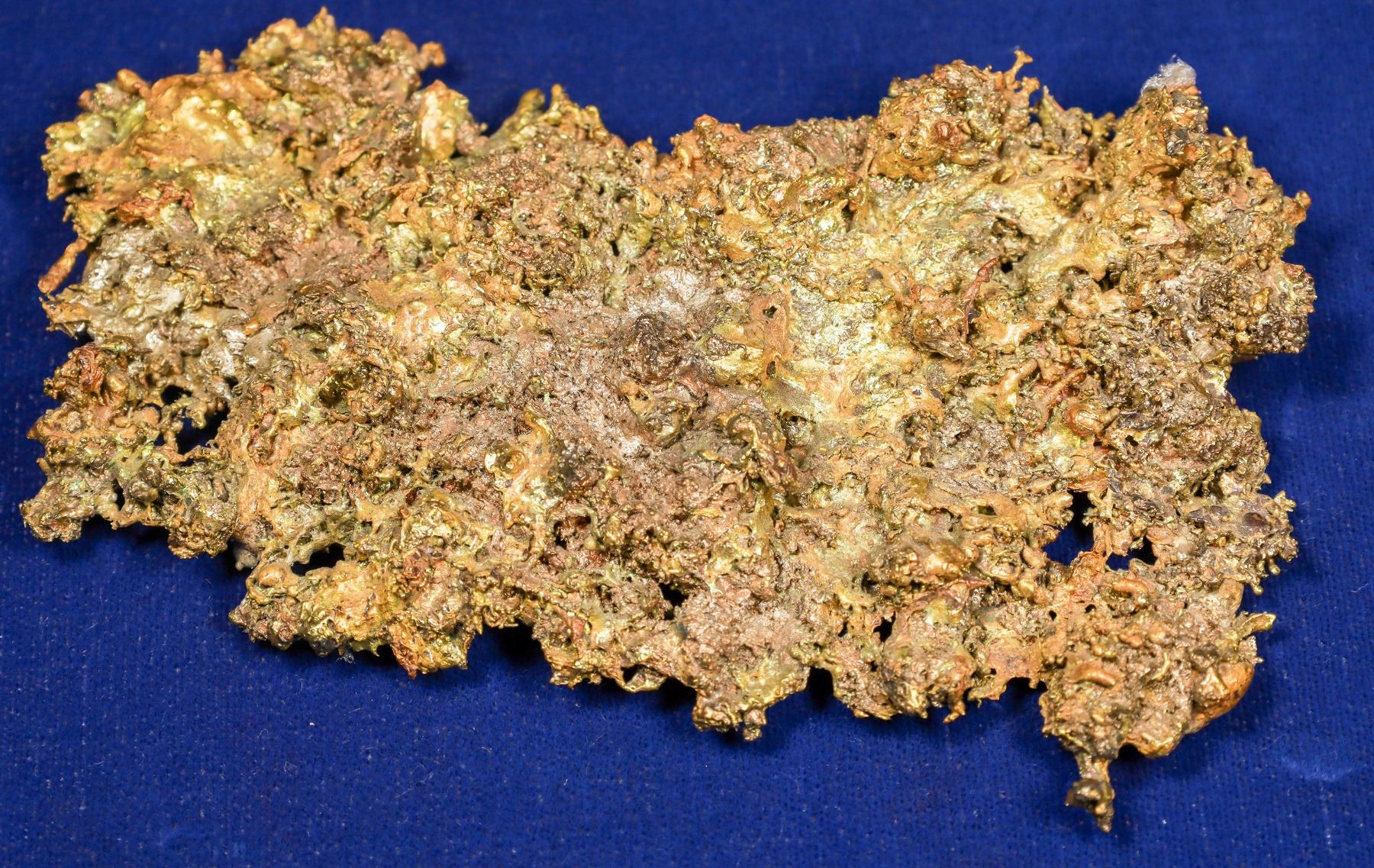 Very attractive silver splash specimen10.11 troy ozs, from the Mayrsohn Collection, possibly from the El Mochito mine. This "splash" specimen appears to be floor spill from dore ingot pouring, and is the type of thing given to mining executives on special visits. We had it analyzed at American Assay, with six sample sites. The average is: 898.1 fine silver, 001.10 fine gold, 007.3 fine copper. It is interesting to note that with the wide array of colors, the variability was relatively homogeneous: Silver 889.87 fine to 922.85 fine; gold 001.04 fine to 001.17 fine; copper 006.30 fine to 009.42 fine.