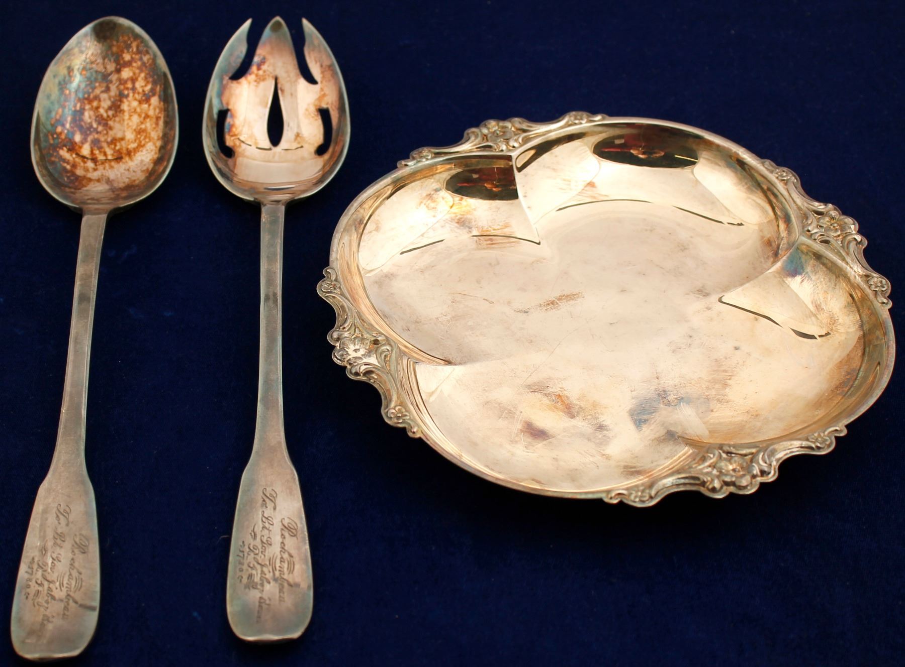 Silver Spoon & Fork, Vintage Gorham, 1780 General de Rochambeau Commemorative Silver Plate Large Spoon & Fork, reads "To Lt. Gov. Jabez Bowen R. J. 1780." Appears to have Crest at back of handle of both spoon & fork. 2" bowl, 10.5" long. _x000D_