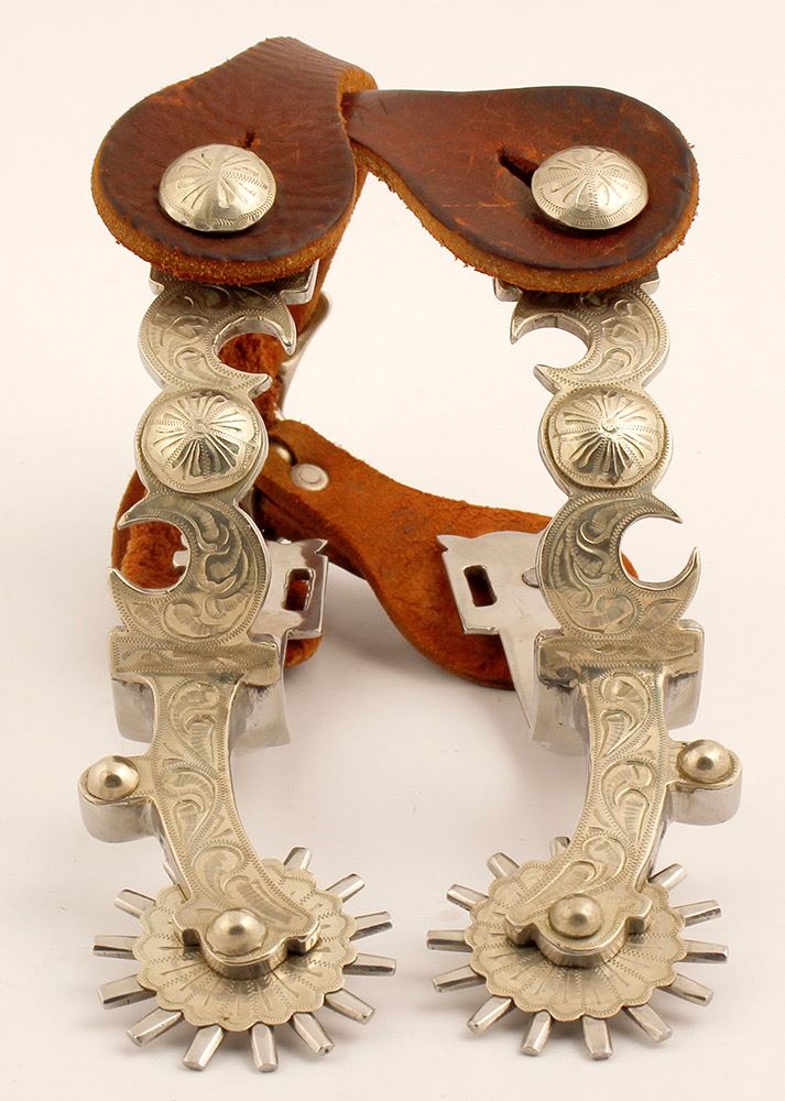 Silver overlaid on stainless spurs. Silver button with crescent moon motif on heel bands. Strap buttons are engraved as well as the covers on the 14 point rowels. HWAC# 62023 Date: Location: