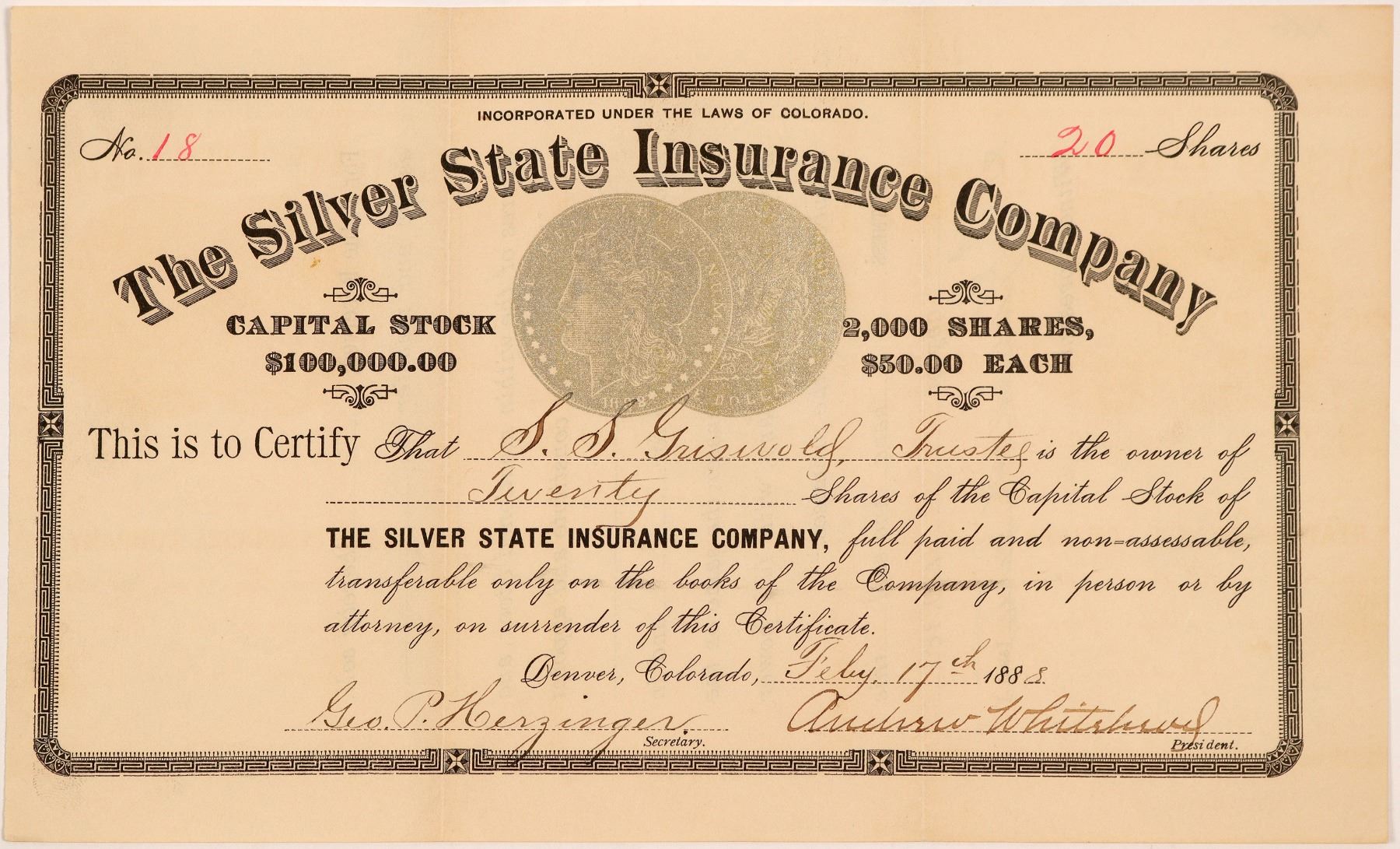 Inc. in Colorado. No. 18, issued for 20 shares to S.S. Griswold, trustee, on Feb. 17th, 1888 in Denver, Colorado. Signed by president Andrew Whithevel and secretary Geo. P. Hersinger. Not cancelled. Black border and print, Morgan dollar vignettes! Folds, some toning. 5.5 x 9" No information located. Ken Prag Collection