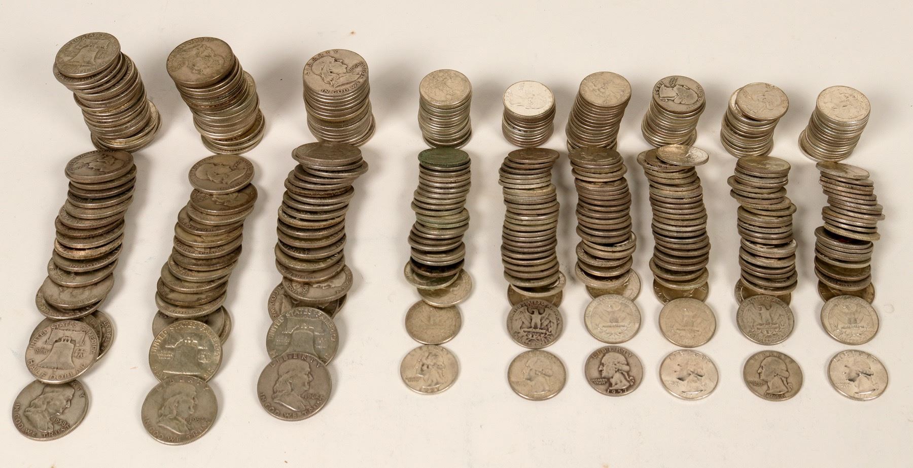 Lot of three $20 rolls of Franklin half dollars, and four $10 rolls of Washington quarters. All 90% silver. $100 face value.