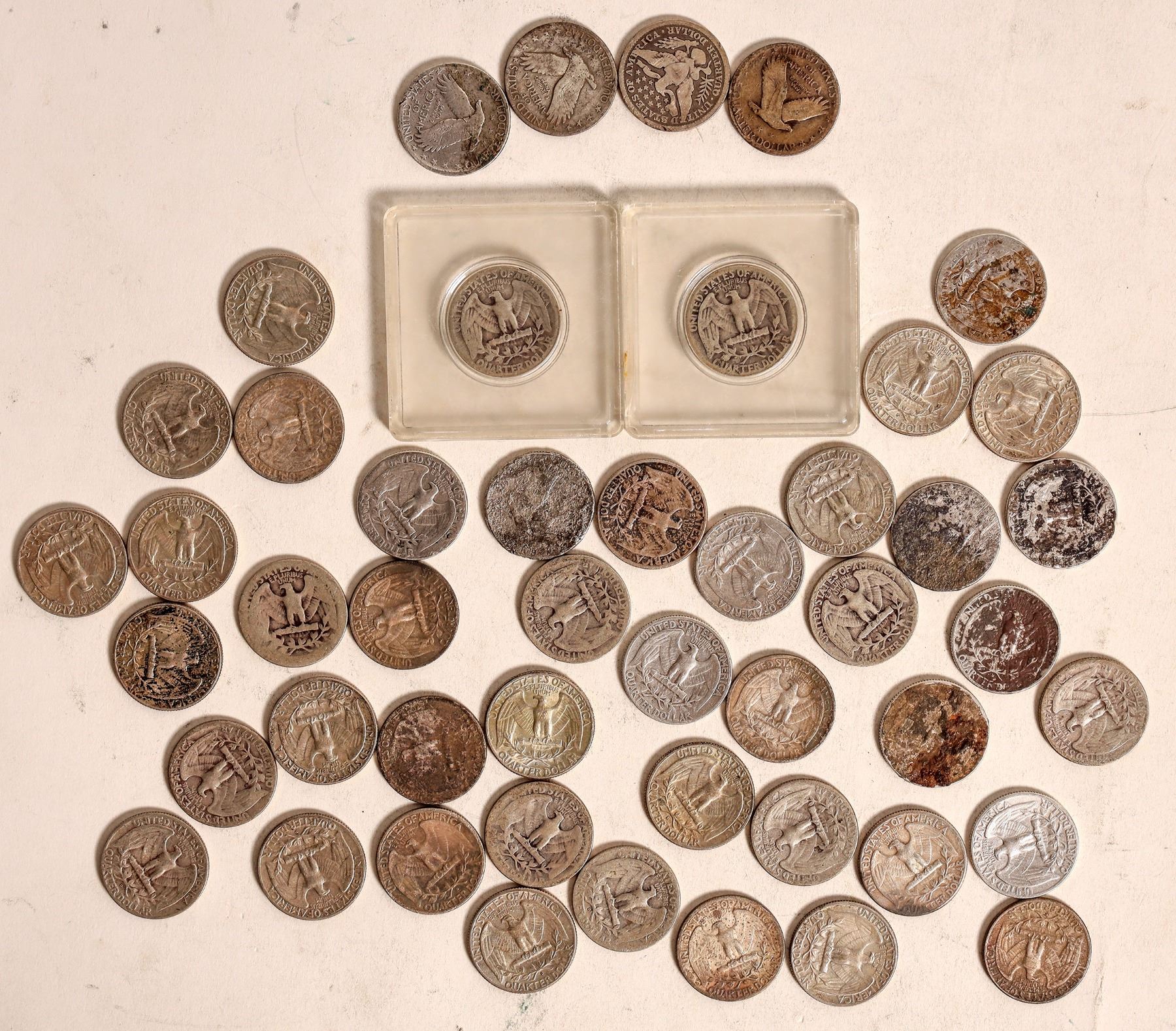 Lot of 48 silver U. S. quarters: 1892 Barber, AG-G; three Standing Liberty quarters: 1930 and two unreadable dates, PR-FR condition. 44 Washington quarters, a few corroded metal detector finds, but many VG-F condition.