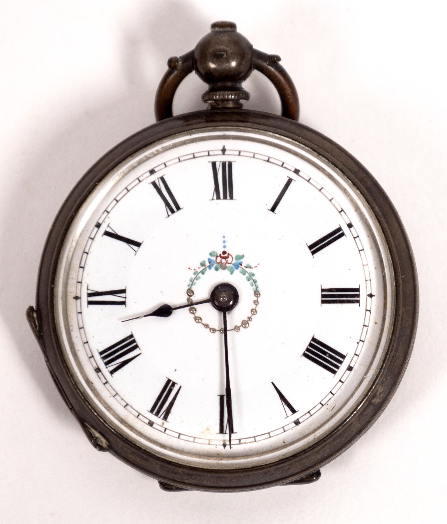 Ladies open face key-wind fob watch (no key). Silver-Argent 0800 JB 21847. Decorative floral design around hands. No hallmark, engraved back, tarnished. State: City: Date:c late 1800's Provenance:
