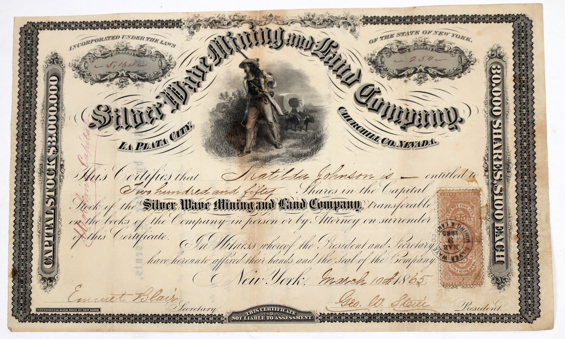 Stock certificate from the Silver Wave Mining and Land Company in La Plata City, Churchill County, Nevada. This certificate for 250 shares was issued to a woman named Matilda Johnson on March 10, 1865. It is signed by the secretary and the president of the company. Pictorial certificate with a vignette of a pioneer with a cover wagon. Revenue stamp in the lower right corner. 11 x 6.5 inches. Good condition.