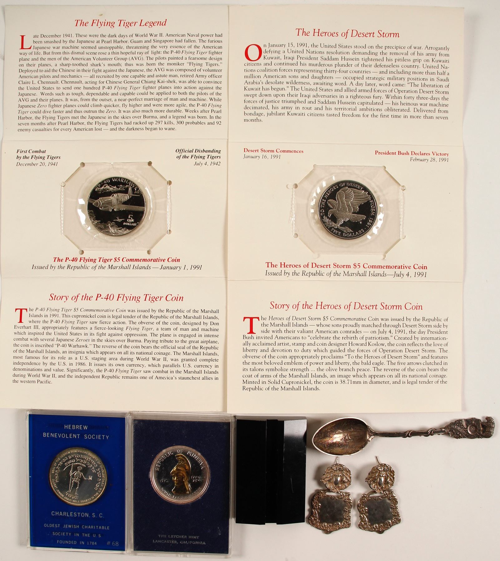 Sterling silver earrings and an 1898 San Francisco souvenir spoon; 1973 Republic of Minerva silver coin; First Jewish Patriot of the American Revolution; 1991 Marshall Islands Heroes of Desert Storm commemorative; 1991 Flying Tiger $5 commemorative Marshall Islands. State: City: Date: