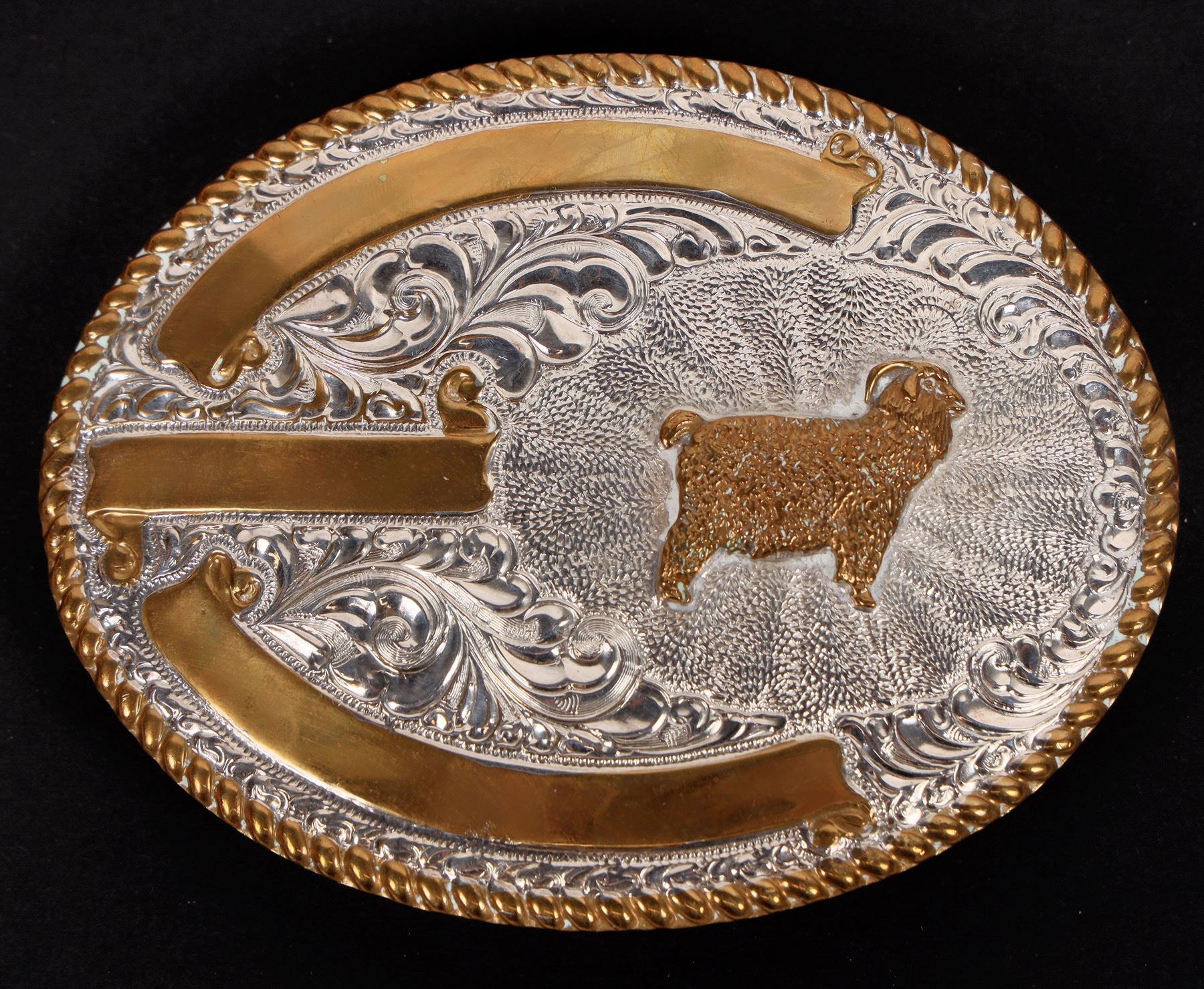 A silver colored Western-style engraved belt buckle with gold embellishments, including a sheep, a trophy for "mutton busting," ready for engraving. Appears to be silver and gold plated. Gold embellishments include a raised 1-1/4" x 1" very detailed ram (sheep with horns), edging and three raised scrolled areas for engraving. Stamped on rear, "Crumrine Mfg./Made in U.S.A." Crumrine is a Reno, Nevada, based company. Nevada has a Basque heritage, with immigrants first coming to Northern Nevada in the mid-1800s during the Gold Rush. The Basques have been closely-tied to sheep herding in Nevada and neighboring states. The buckle measures 4-1/2" x 3-1/2". This "like new" belt buckle Fits Standard 1.5" Snap on Belts.
