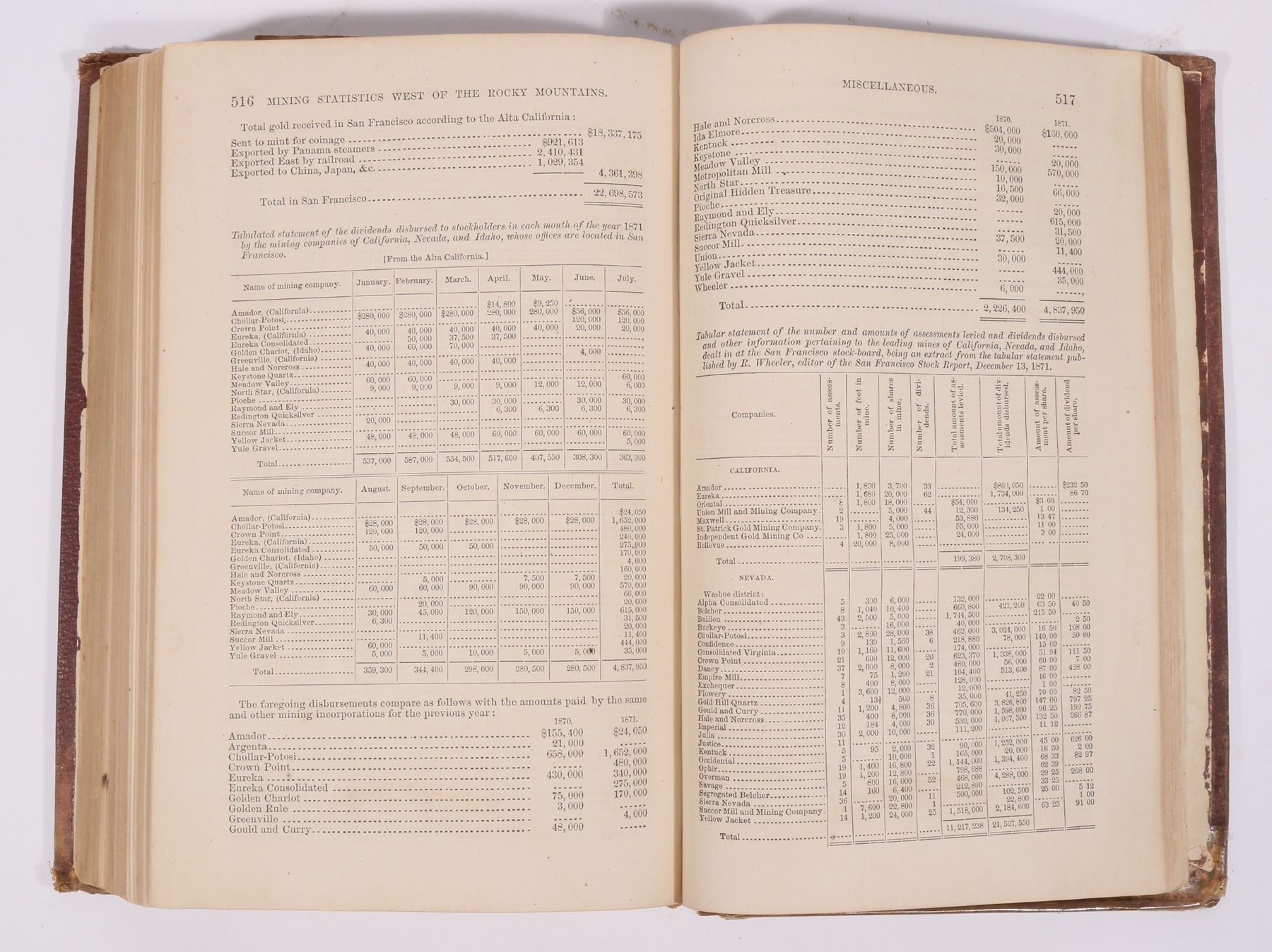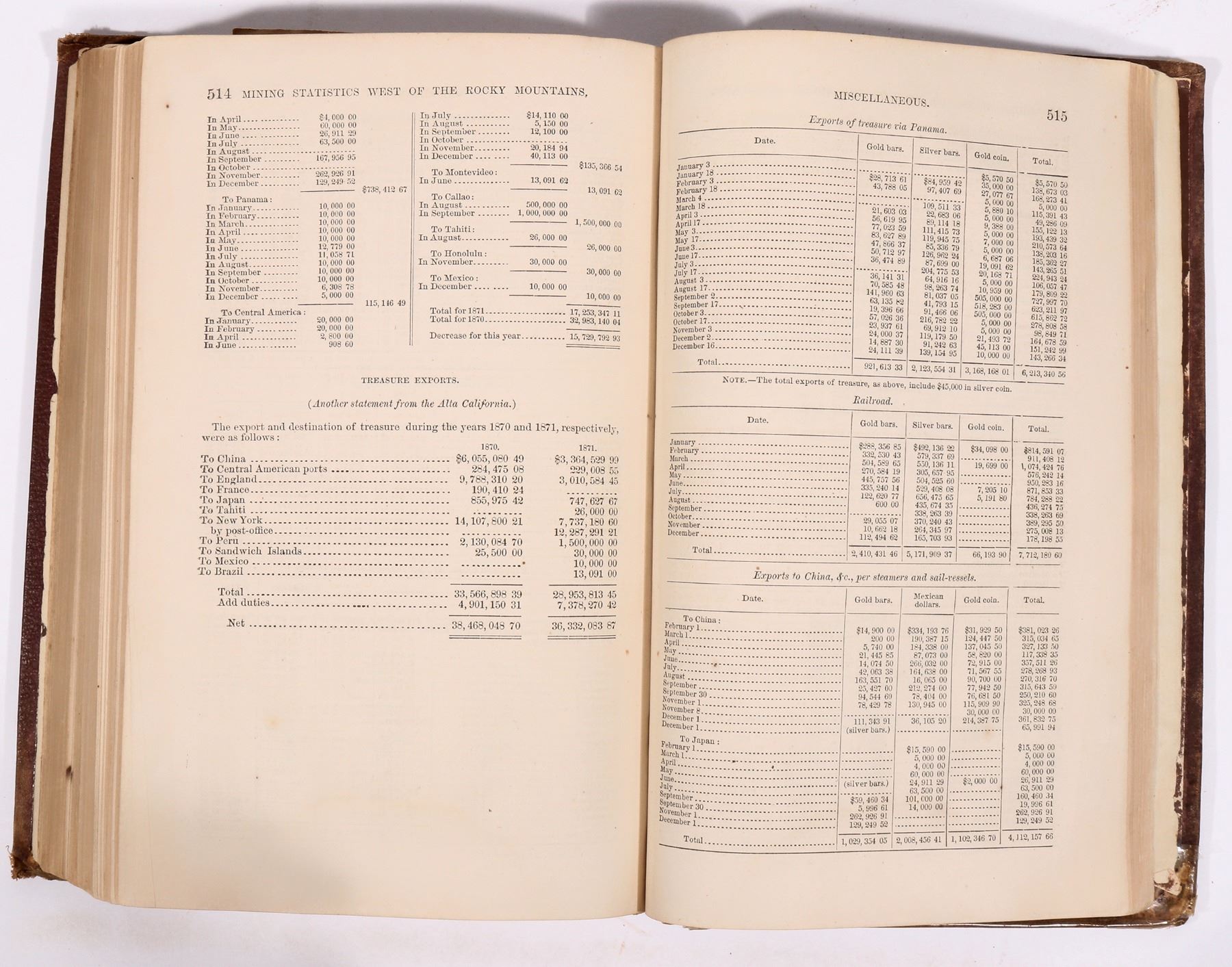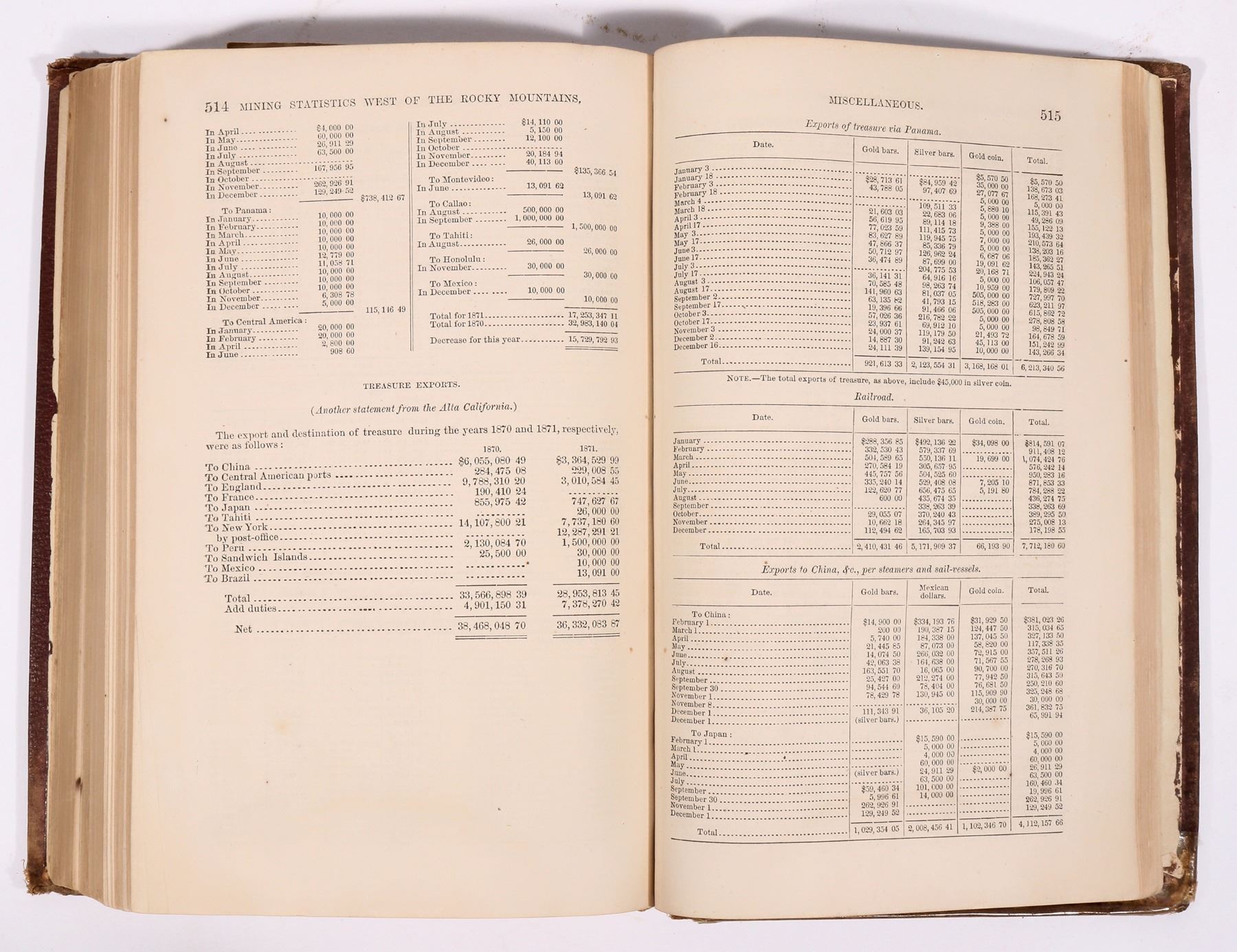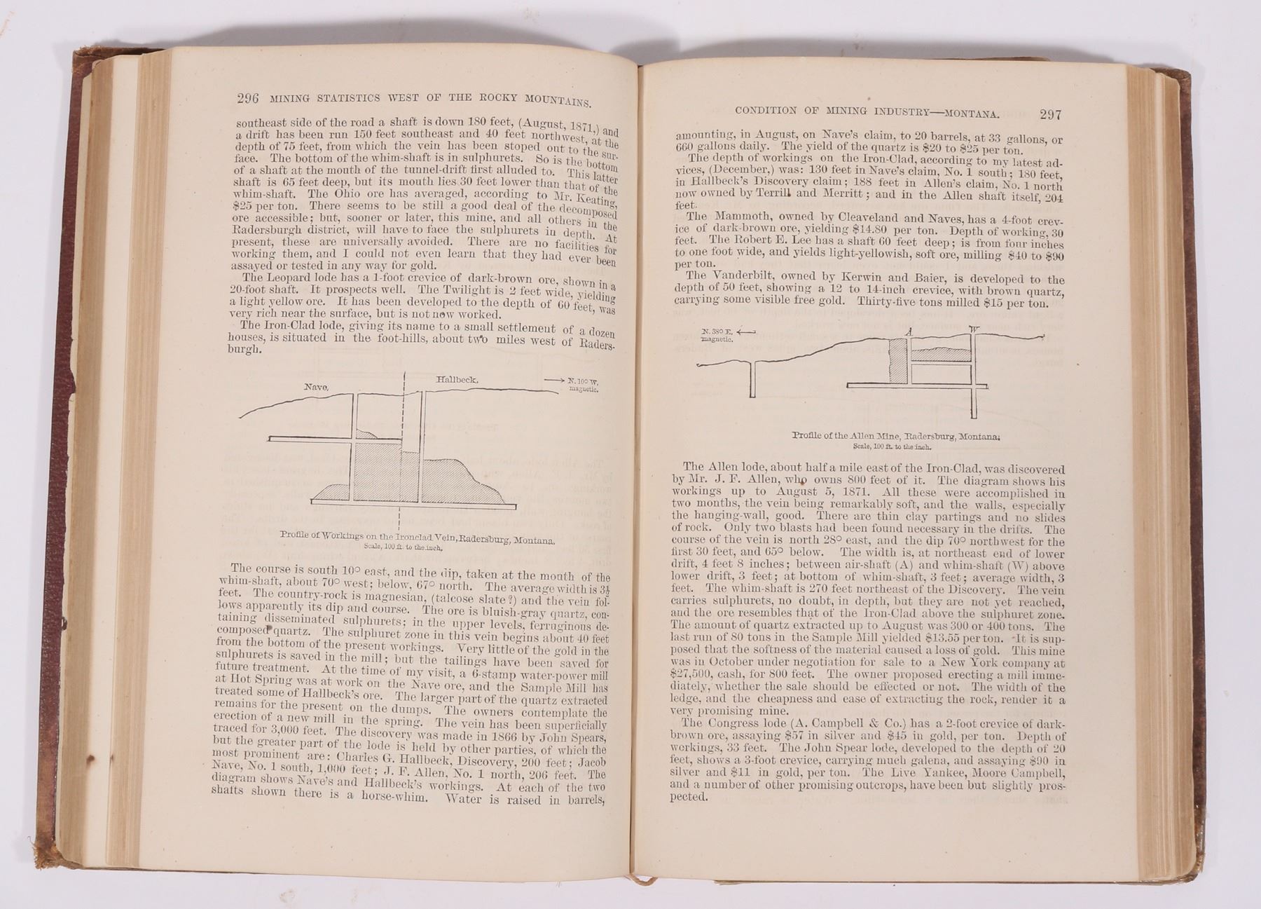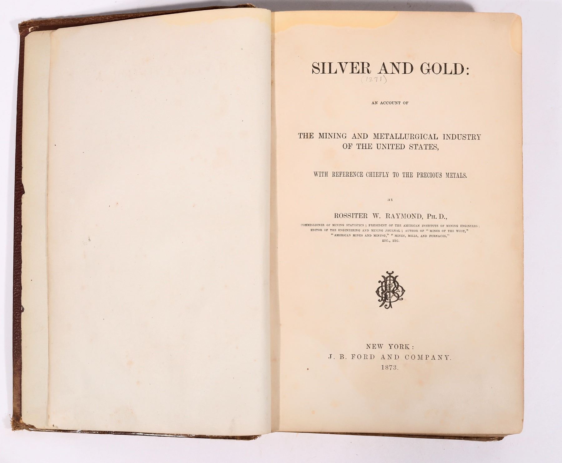 The mining book; Silver and Gold: the Mining and Metallurgical Industry of the United States written by Rossiter Raymond while Commissioner of Mining Statistics in 1871. Privately published by J.B. Ford and Company in 1873 (there is no second edition). This reference book to professionals is triple indexed for clarity. pp. 555. A must-have reference book for early mining in the western states. Well documented and illustrated. Hardcover, good condition with torn binding and foxed corners.