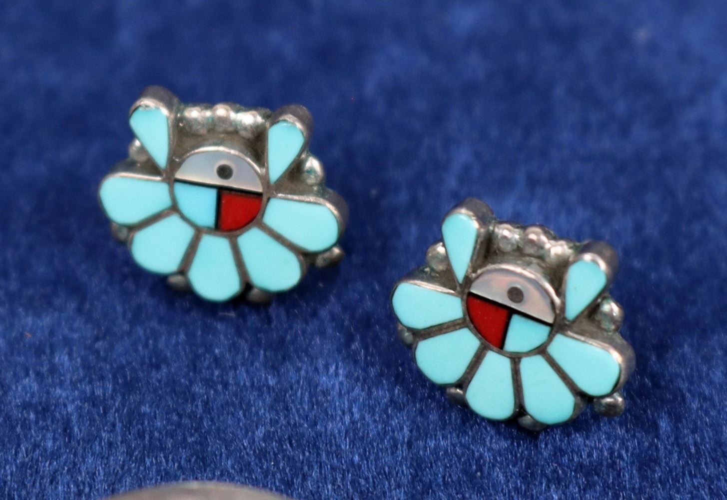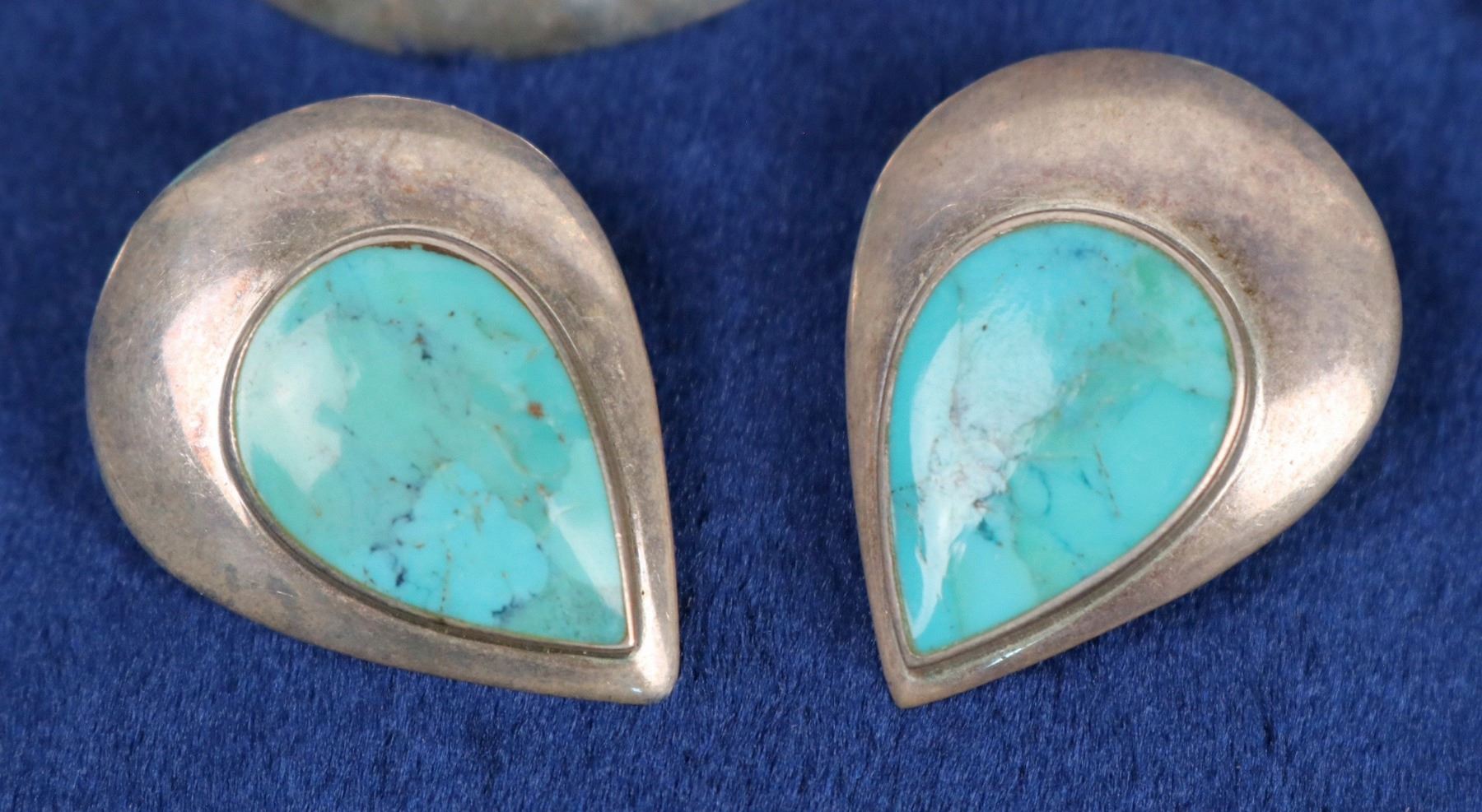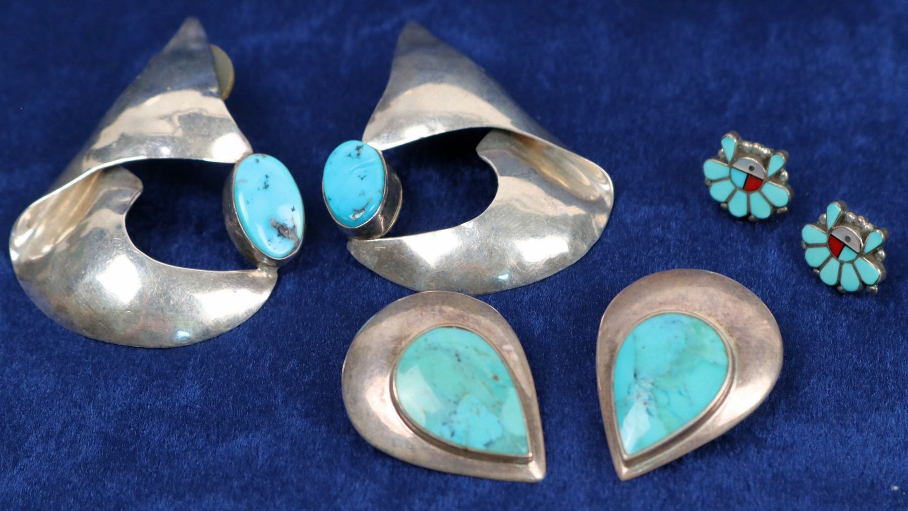 Three pair sterling silver and turquoise earrings. Two are modern designs--one pair cut and folded silver set with oval stones--pierced (2" x 1.5". One pair, teardrop shaped silver with same shaped stones--clip (1" x .75") Tiny--.5" pair Zuni inlay sun design post earrings.