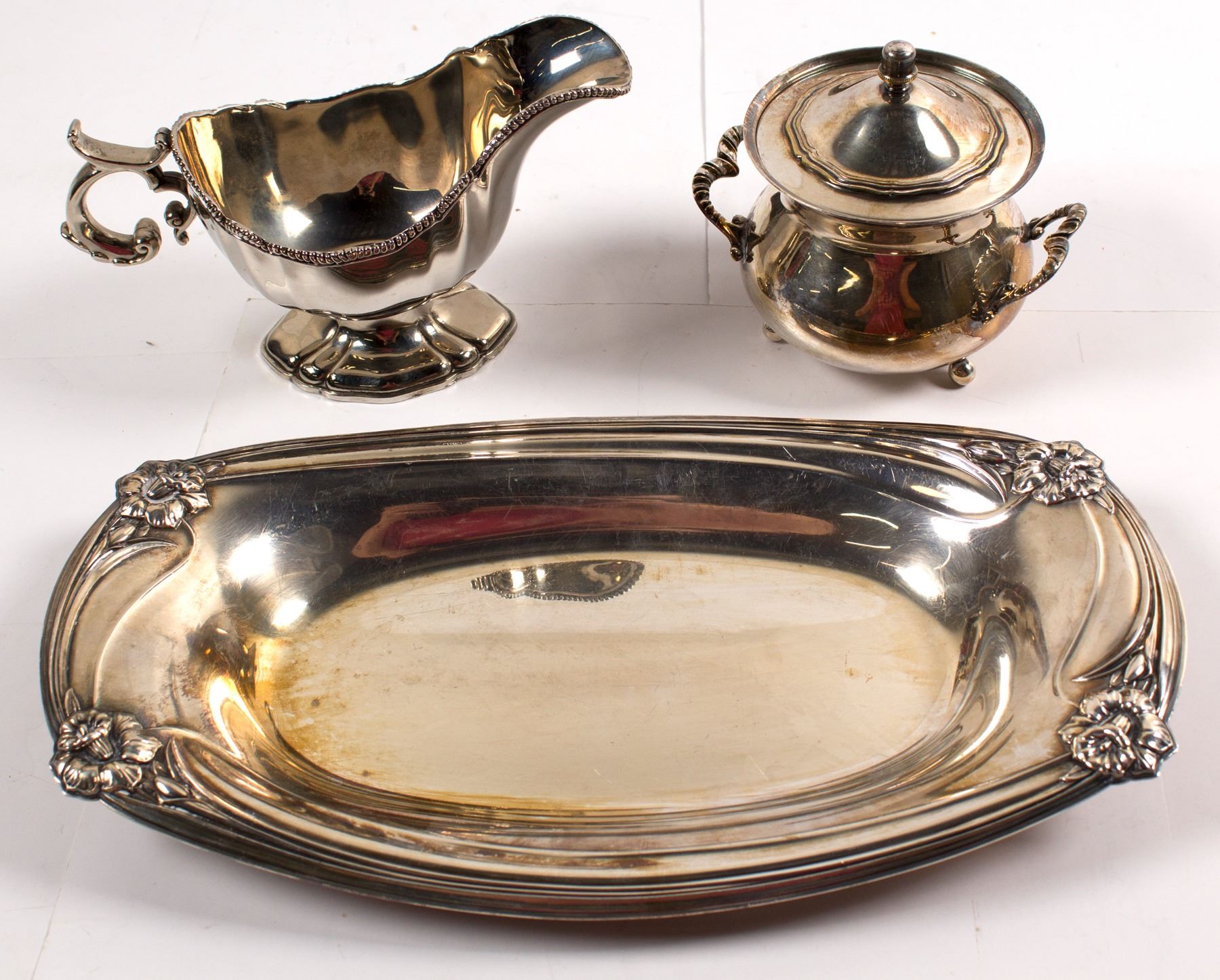 Mismatched pieces, but very nice group. Sugar bowl w/ lid Made in Italy. Creamer, unknown. Tray, Daffodil by Rogers Bros.