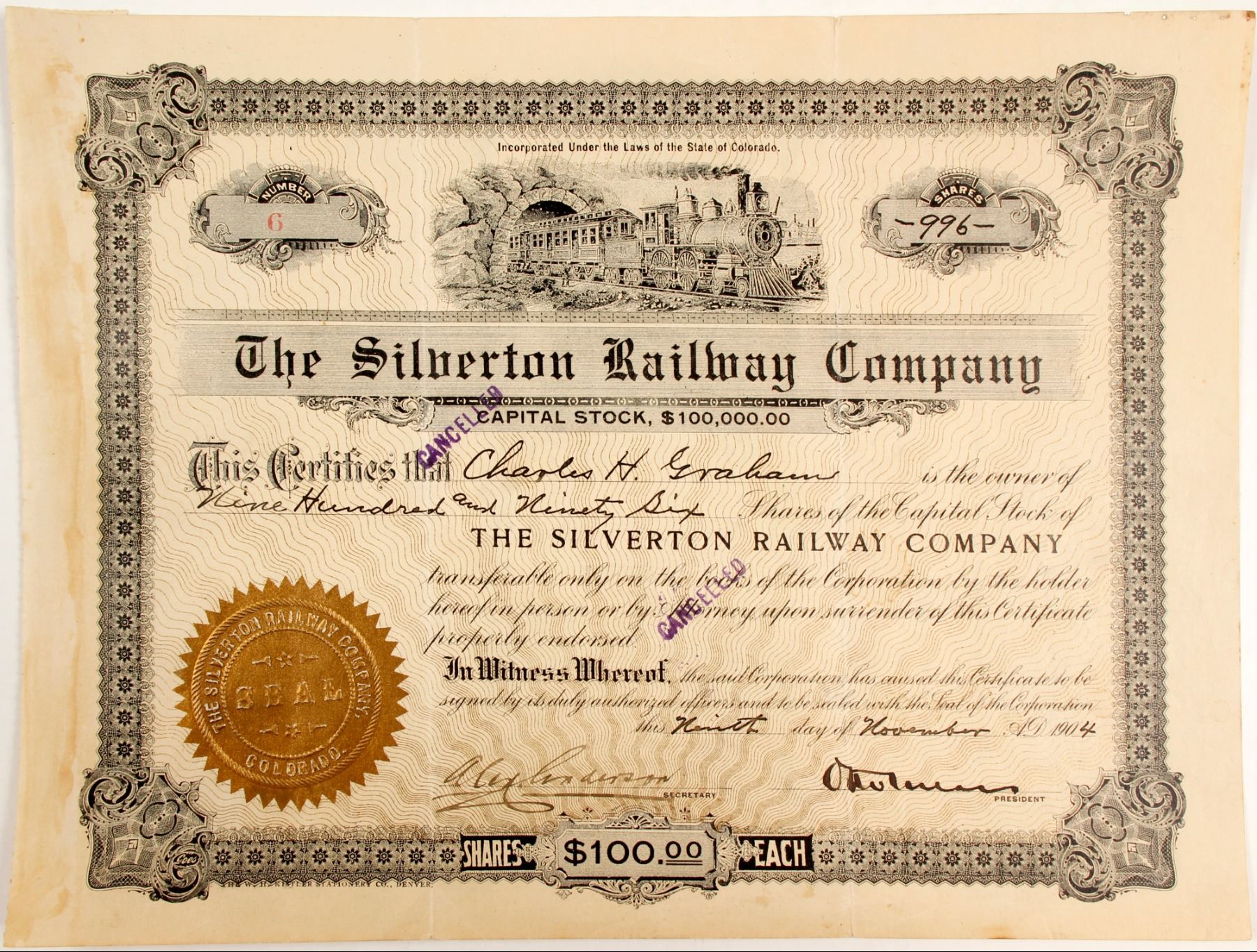 I/C #6 Charles Graham 996 shares 1904 signed by President Otto Mears. Train exiting tunnel vignette. "The Silverton Railroad, now defunct, was an American 3 ft (914 mm) narrow gauge railroad constructed between Silverton, Colorado and mining districts near Red Mountain Pass, Colorado. The Silverton Railroad is remembered for the innovative solutions to difficult engineering problems presented by the steep, mountainous terrain which were devised by the railroad's chief locating engineer, Charles Wingate Gibbs – the Chattanooga Loop, the depot in a wye at Red Mountain, and a covered turntable on the main track at Corkscrew Gulch – and for the unusual and expensive annual passes presented by the owner, Otto Mears." from wikipedia. Left toning, right pin holes. Prag Collection State: City: Date: 1904 HWAC# 84157