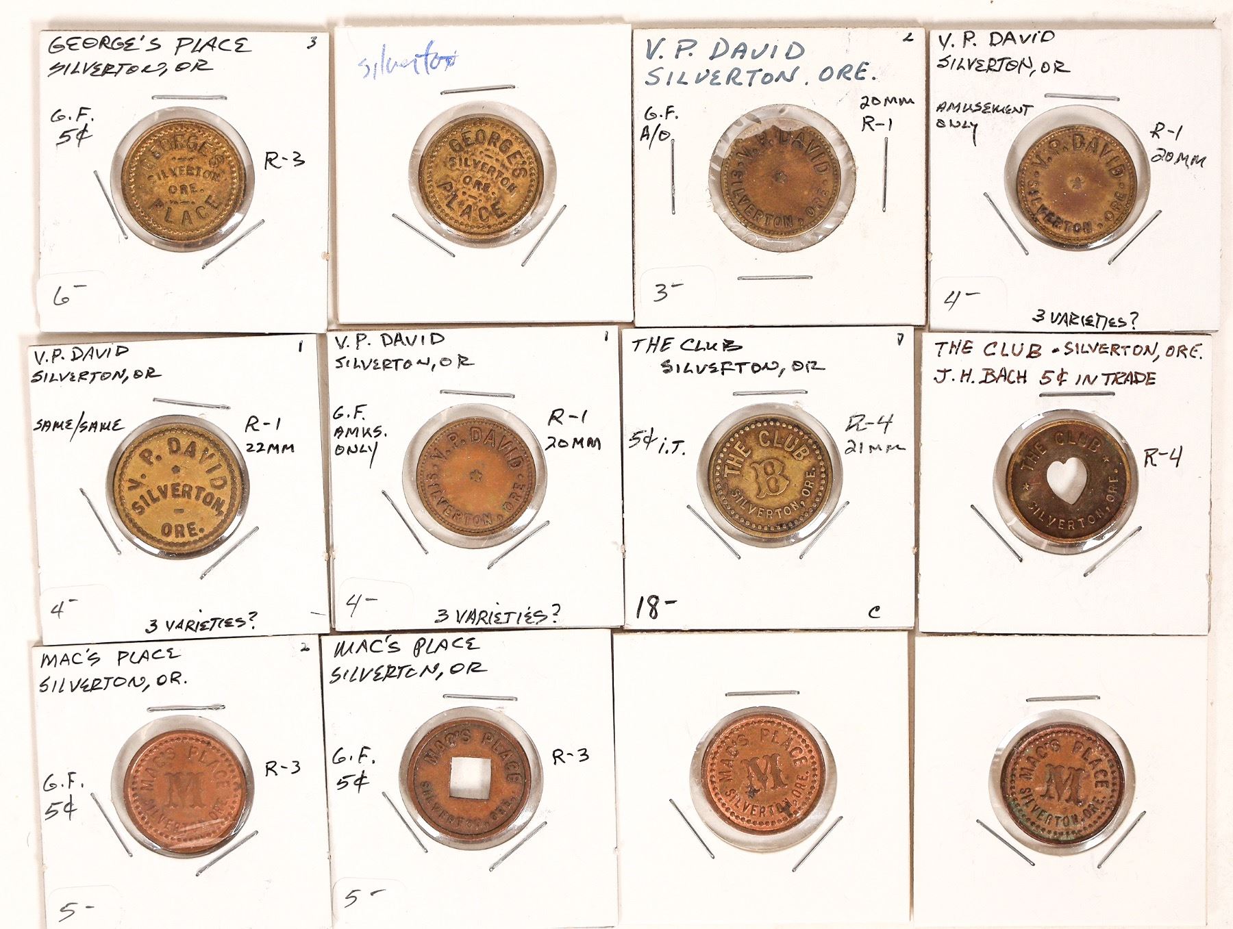 Twelve tokens from the Marion County town of Silverton: Mac's Place (4); George's Place (2); V. P. David (4); The Club (2).[ Silverton Oregon