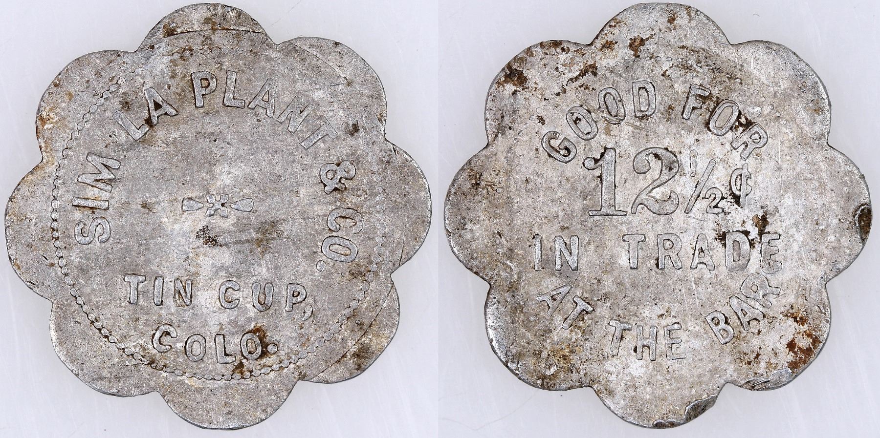 Simeon H. La Plant owned a saloon in 1903: SIM LA PLANT & CO. / TIN CUP, / COLO. // GOOD FOR / 12Ω¢ / IN TRADE / AT THE BAR (¢ points to right foot of R in FOR); Al., Sc 8, 29 mm.