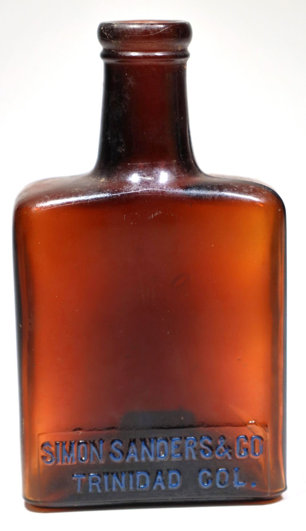 Preble W-141. Simon Sanders & Co / Trinidad Col. Amber bottle, 5 5/8", wiped top. Blue lettering. Minor surface wear, adhesive sticker on reverse. Please inspect.