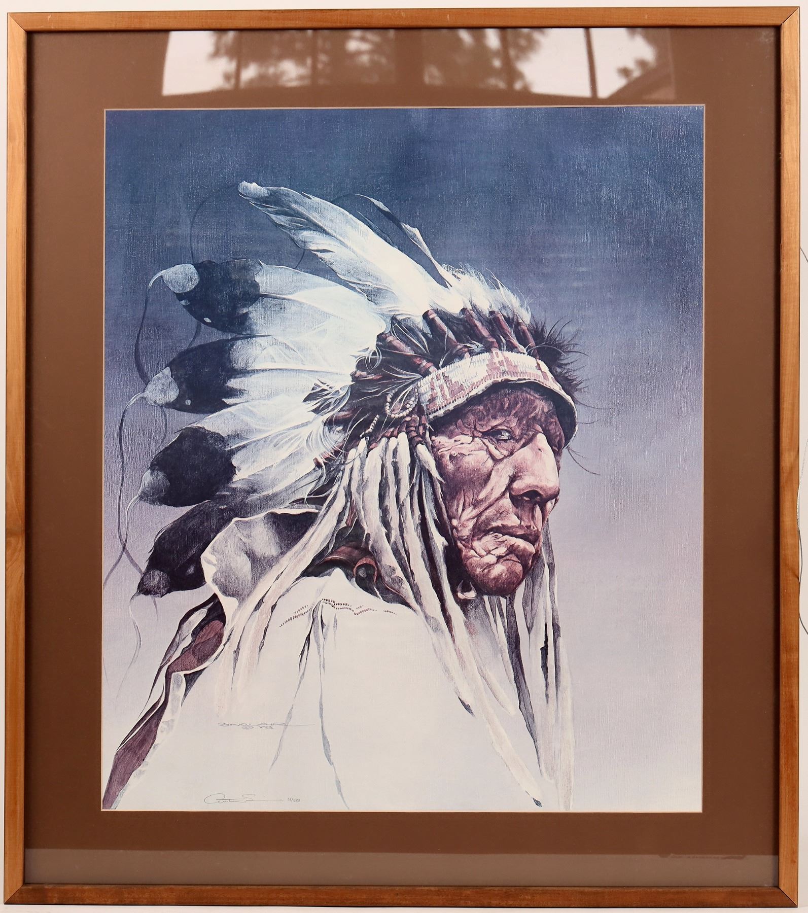 Portrait of a California Cheyenne chief by Sinclair. Anthony Sinclair is an American Postwar & Contemporary painter who was born in 1943. Signed print, 31/500. Framed 36" x 30".
