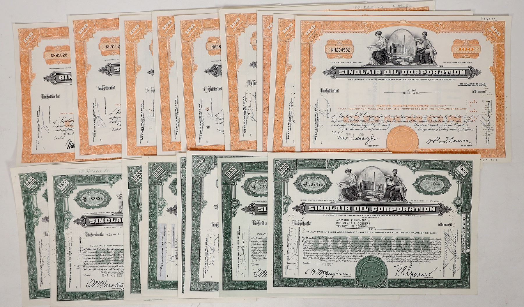 Group of 19 stock certificates from the Sinclair Oil Corporation, dated 1951 through 1968. The lot contains both orange and green certificates. All are both issued and cancelled. Nice vignette of oil infrastructure. Good condition.