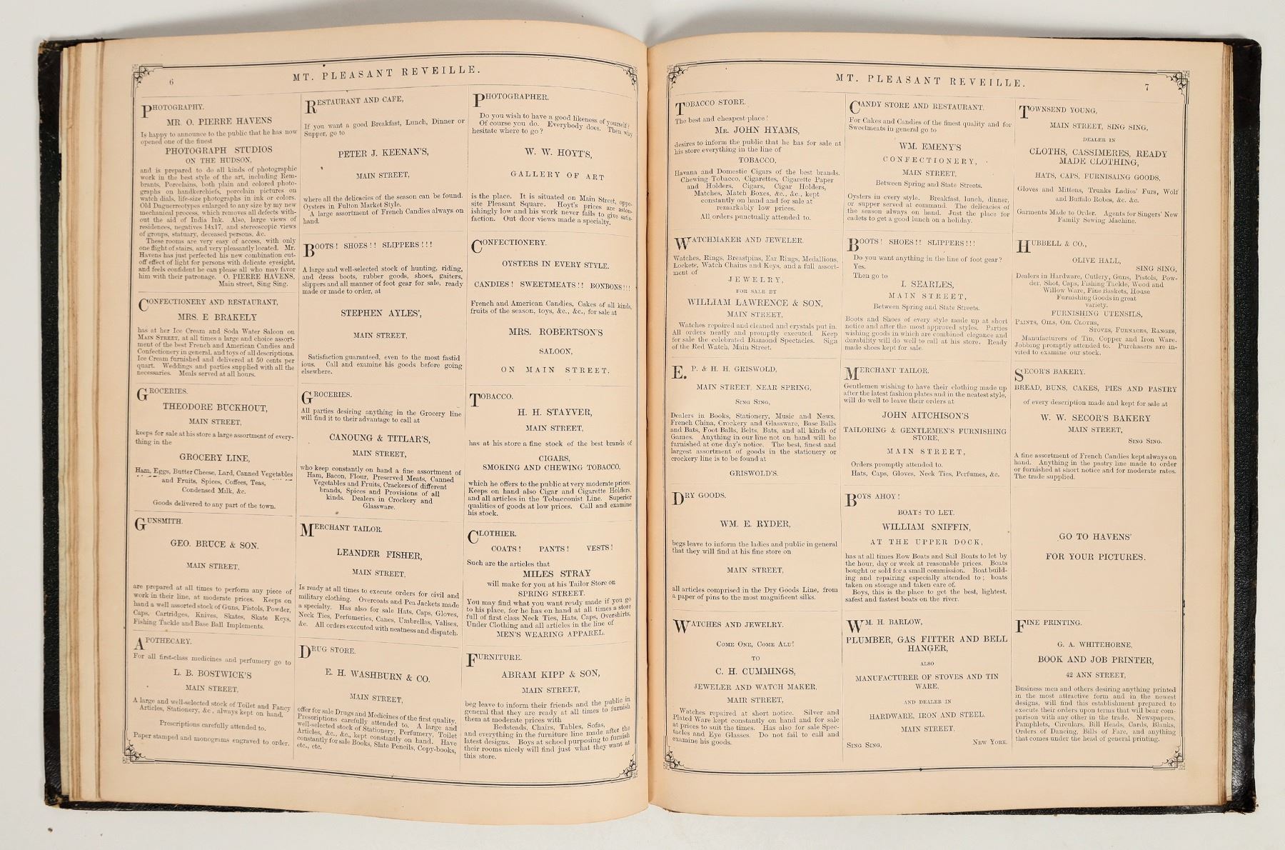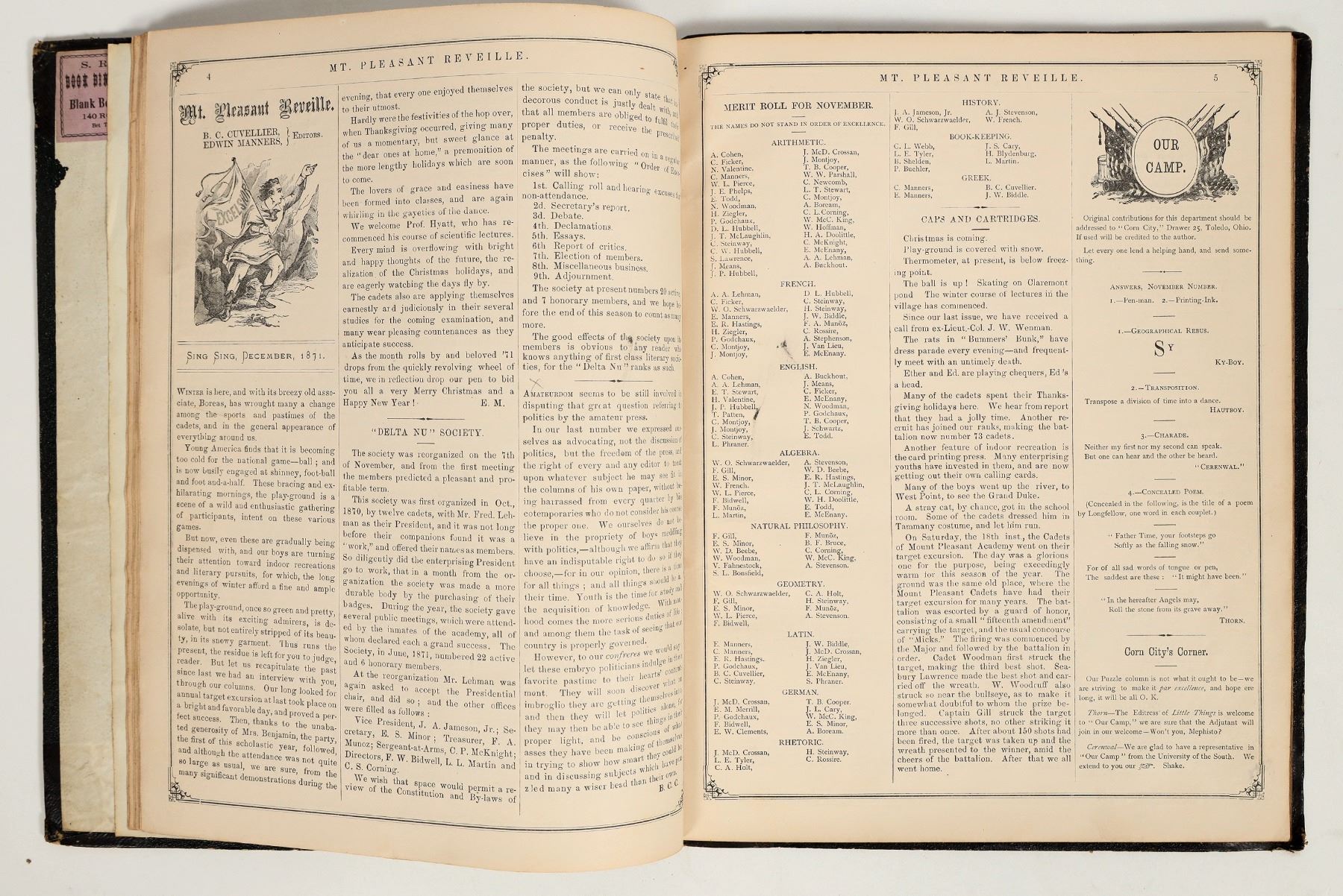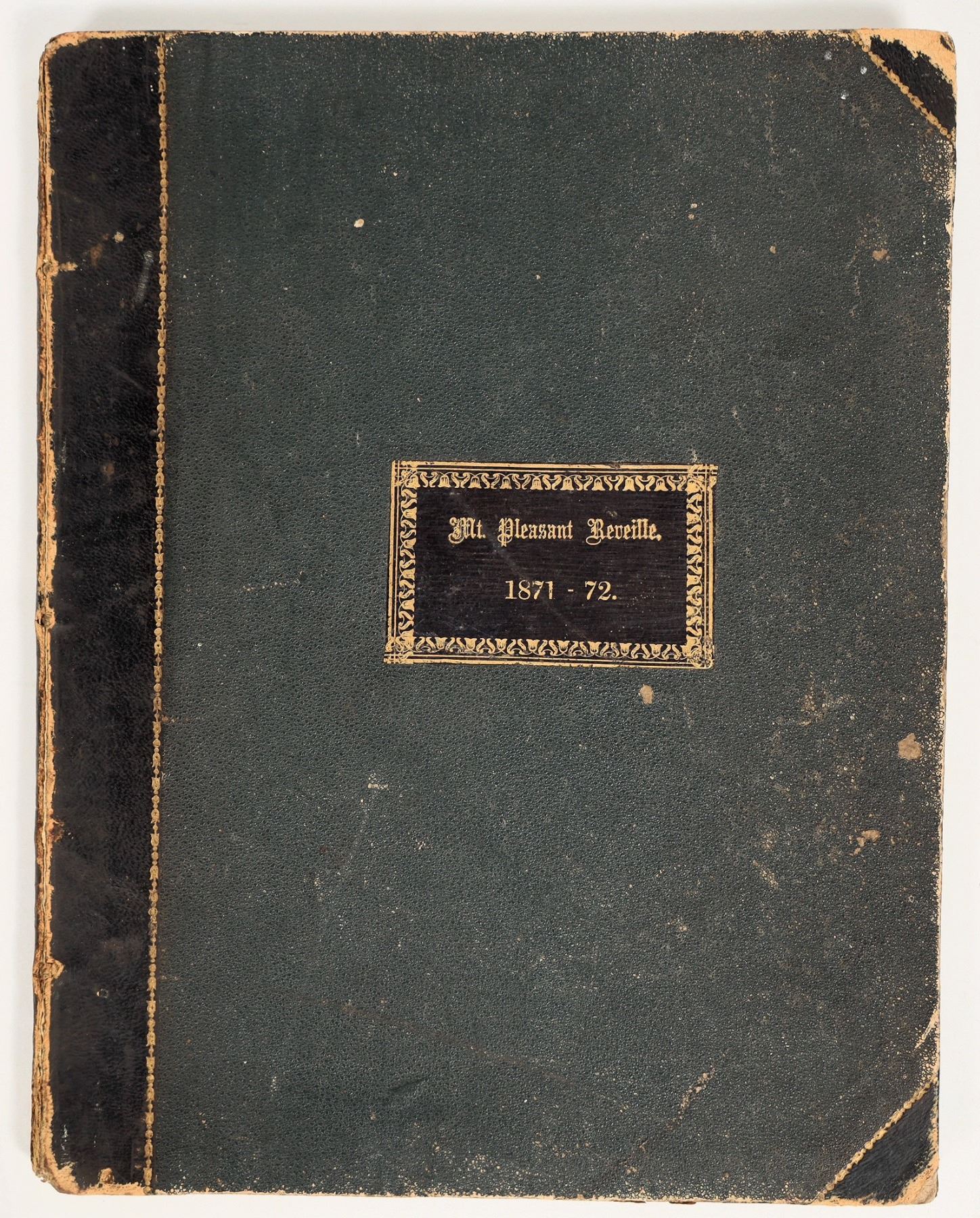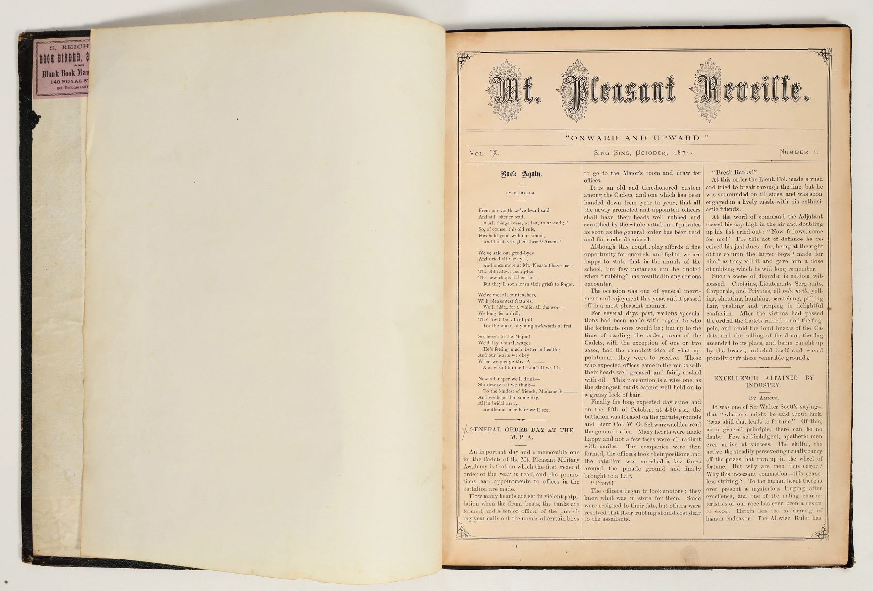 A hardback, bound book compiling the 1871 and 1872 issues of the Mt. Pleasant Reveille, a newspaper from the Mount Pleasant Military Academy of Ossining/Sing Sing, New York. The issues contain poetry, stories from the Academy, advertisements, and more. Pages are generally in good condition with light toning, though significant cosmetic wear is visible on cover/spine/interior end papers; see photos.