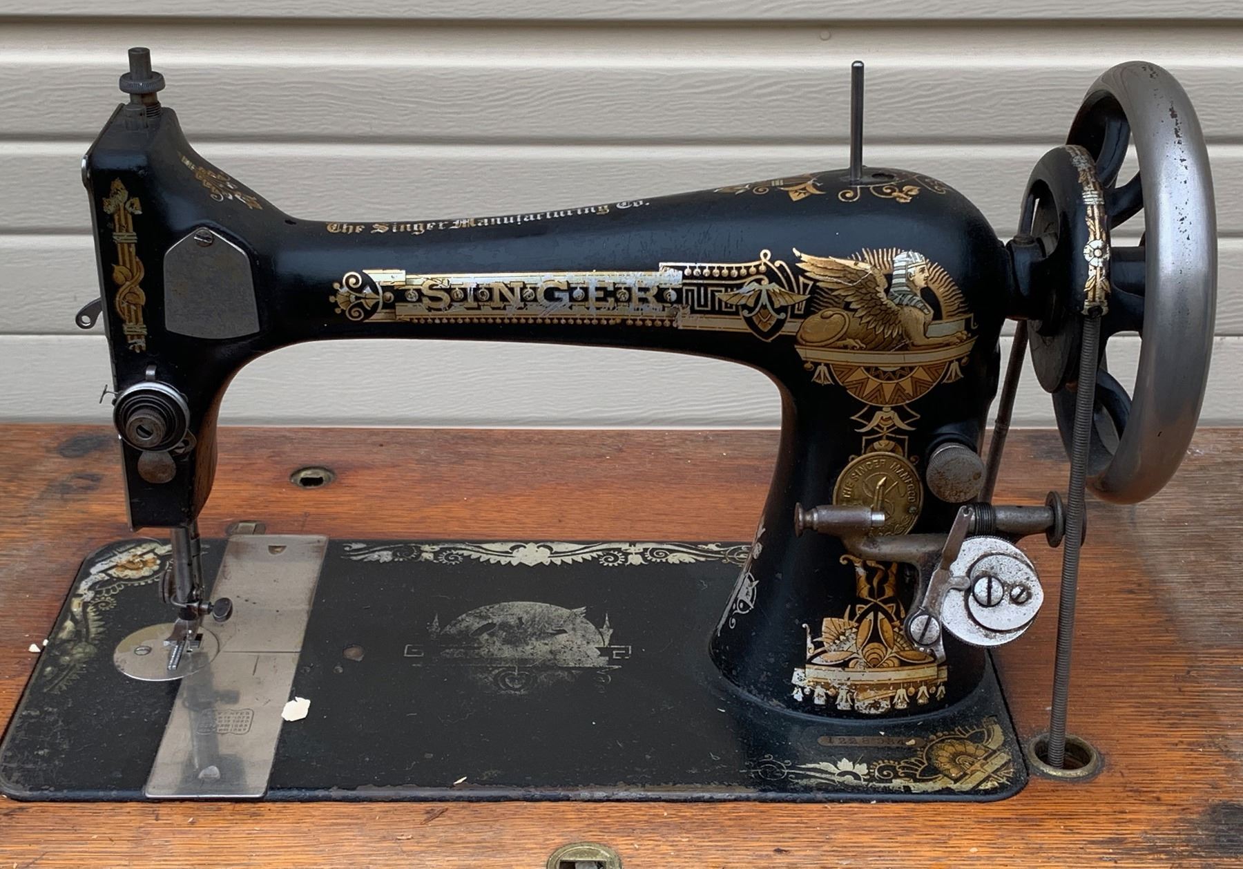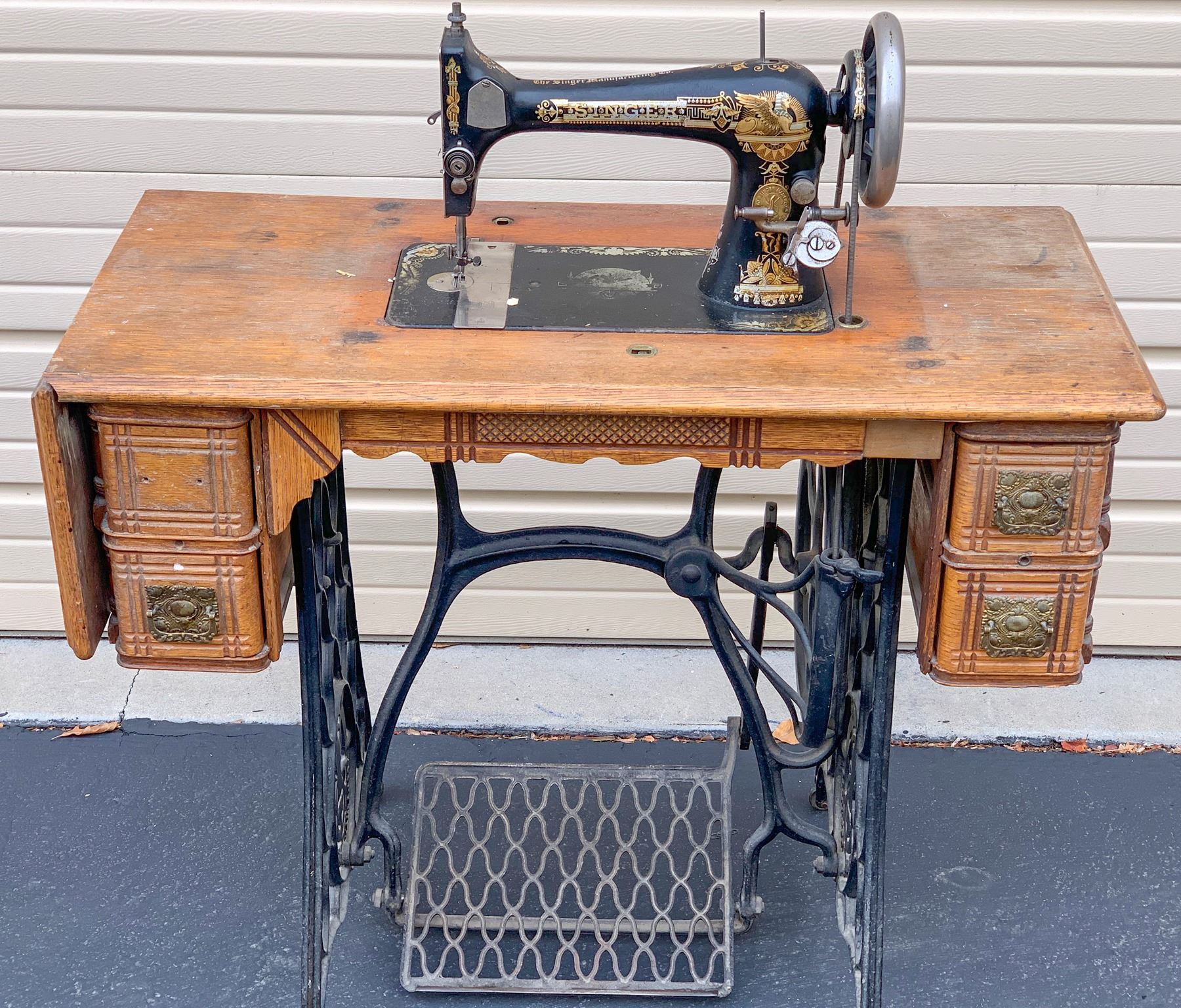 Here we have one of the all- time classics. It is a Singer Sewing Machine. This example is called the " Memphis Sphinx " , because it has the the embossed sphinx, with the head of a Pharaoh, and a body of the wing lion ( Like king Tut, and his father Akhenaten ). The embossing is an elaborate gold, silver and blue, on a black back ground. Very impressive. It is also oak wood, and has the original oak wood cover, which is really rare. All machines made before 1900, have no letter prefix in the serial number. Serial number on this machine is : 12.289.343., 1893-1894. Overall great condition, with operation treadle, and side hand wheel. Needs a little furniture polish to make is glow. Left top handle pull, from drawer missing, otherwise a really nice piece of Early Americana.(*Note, local pickup advised, because shipping on this item, would be considerable !! ).( RH).