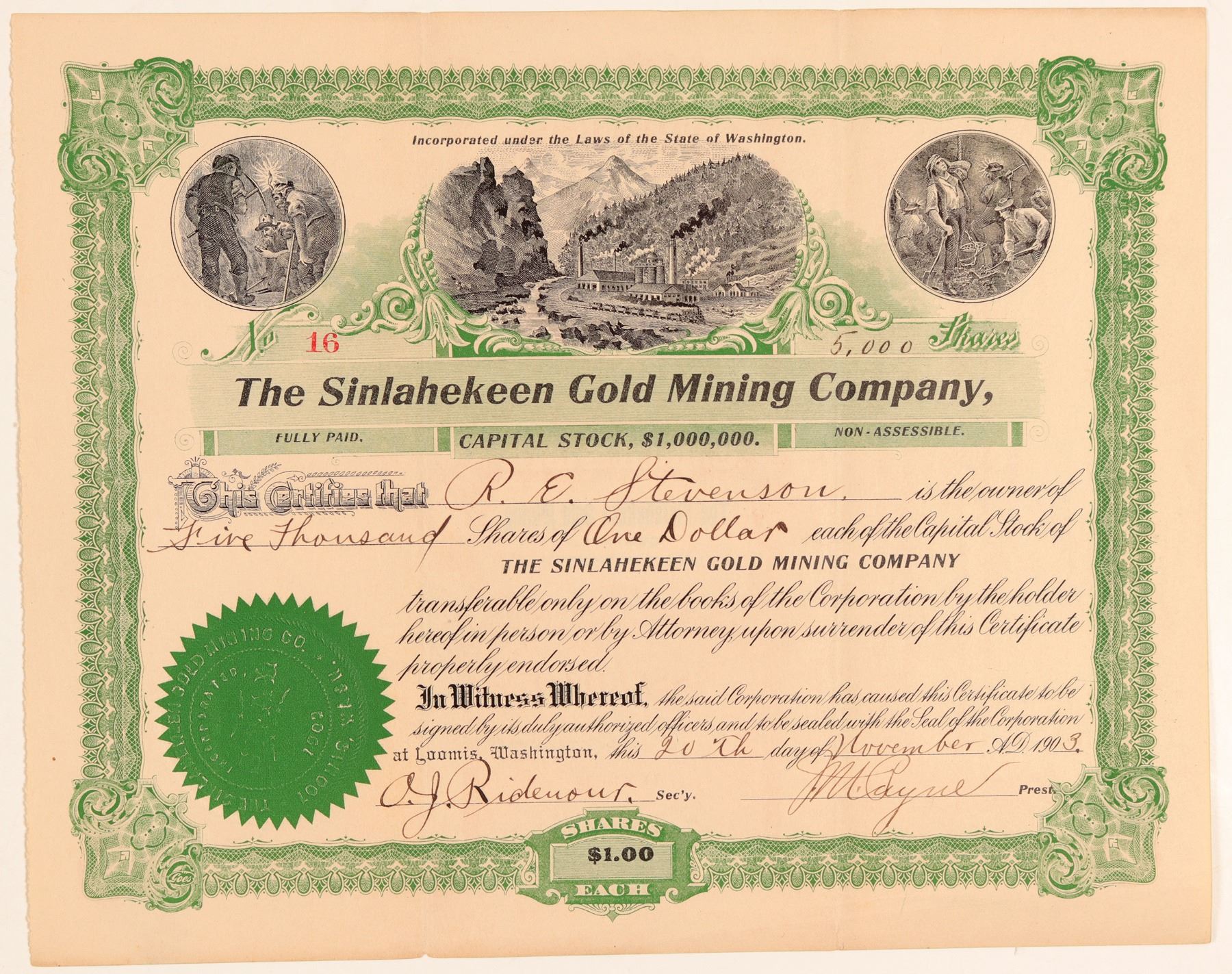 Early # 16 for 5,000 shares to RE Stevenson. Signed by Ridenour and president Payne. Dateline Loomis, Washington 1903. Incorporated in 1902. No cancelled. Fold edge nicks, otherwise very nice. Black and Green on White. Three mining/milling vignettes. "This company owns ten claims on Douglass mountain, six miles south of Loomis. A tunnel is being run to cross cut a 4 foot vein shown on its St Paul claim. The tunnel has now been run 90 ft and has passed the point on surface where ledge is visible. The rock is strongly mineralized and shows unmistakable evidences of copper values." [Engineering and Mining Journal, Volume 79, 1905] Ken Prag Collection