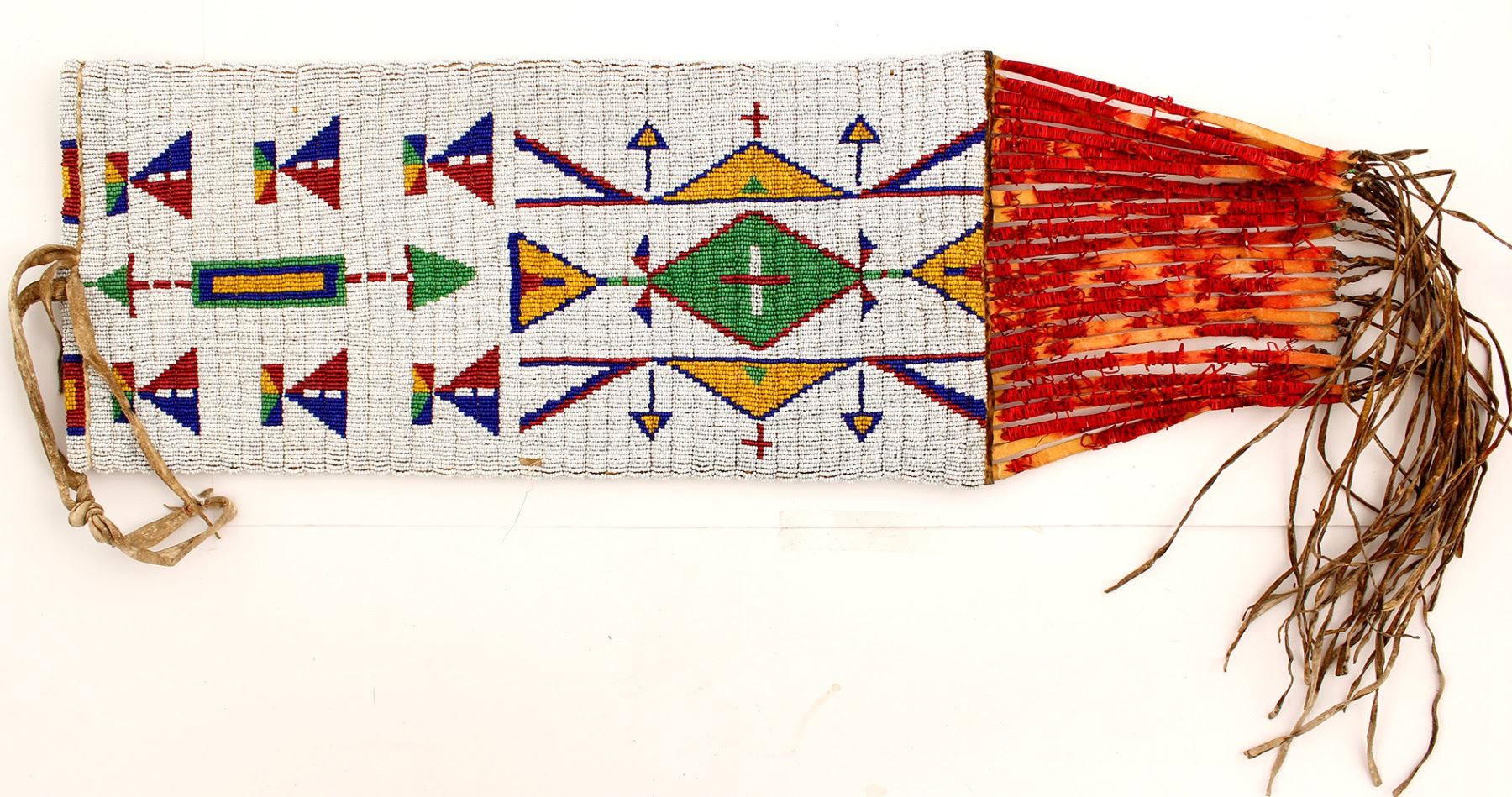 A magnificent beaded Sioux pipe bag, with porcupine fringe. The piece is completely beaded on its entire 16"x 7" pouch surface. the fringe measures another 16" in length and has some missing quills, due to age. This is a beautiful piece that would add class and history to any American Indian collection. Date: Location: HWAC# 56631