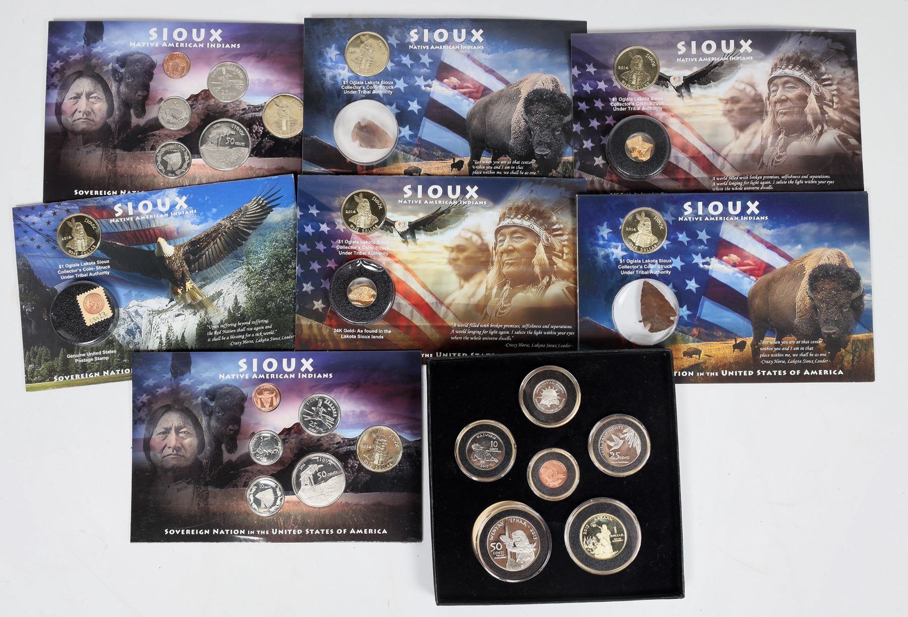 Seven commemorative sets authorized by the Oglala Lakota Sioux Nation to raise tribal profile and provide income for tribal needs. Each card has a medal and some native gold or an arrowhead or a commemorative stamp. Also a six medal boxed set of the first commemorative set issued by the Jamul Indian Village in 2015.