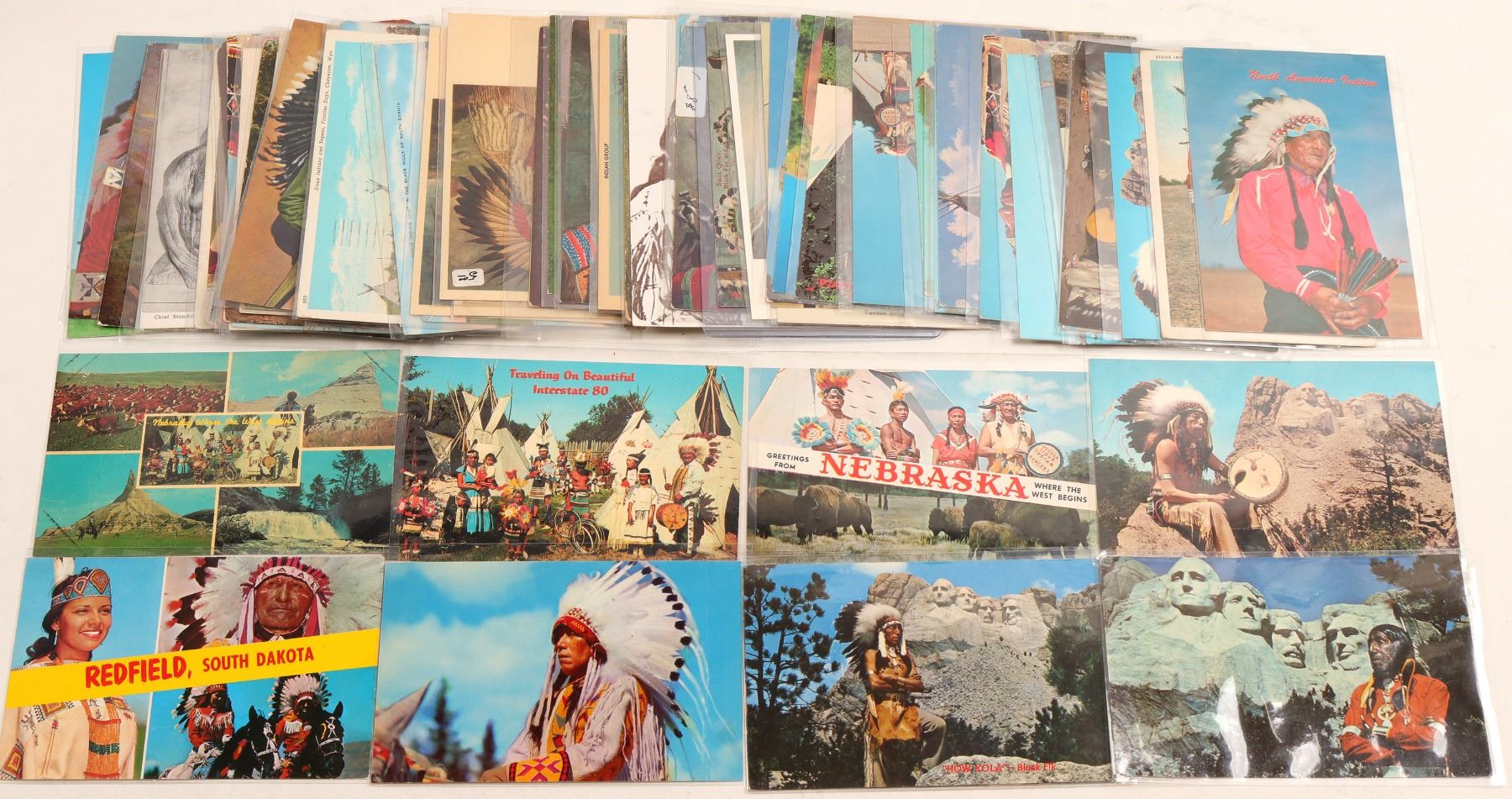 97 mainly color post cards of Sioux tribe members, children playing drums, in front of teepees,and in native dress. There are postcards from Pow Wows, in front of Mt. Rushmore and with chiefs in full dress. Other postcards show daily activity such as making bread, squashs carrying babies in papooses and Black Hills attractions. Some duplicates postcards. Brian Thaler Collection