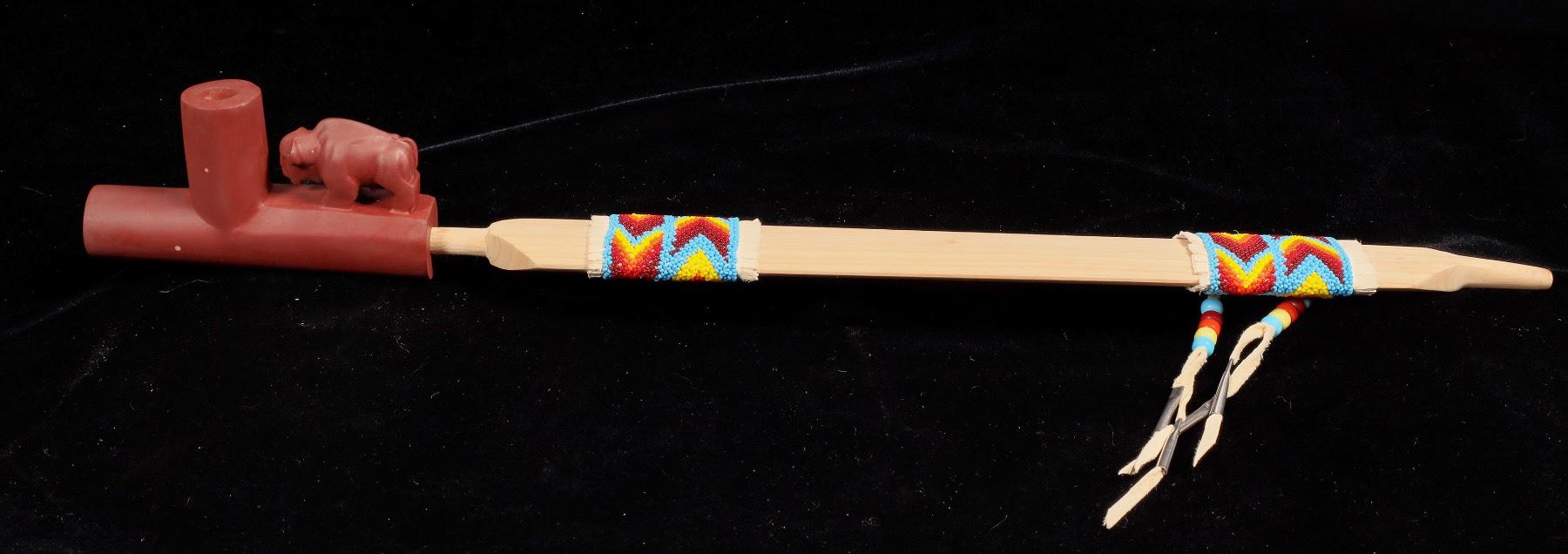 Carved by James Under Baggage, the bowl piece measures 6"x 3" and depicts a standing buffalo. Stone shows a few minor imperfections. The peace pipe portion is 19 in. in length with six facets and turned ends. There are two bands of deerskin wraps with seed beads. A chevron pattern in beads red, orange, yellow, and blue. Made on the Sioux reservation. South Dakota