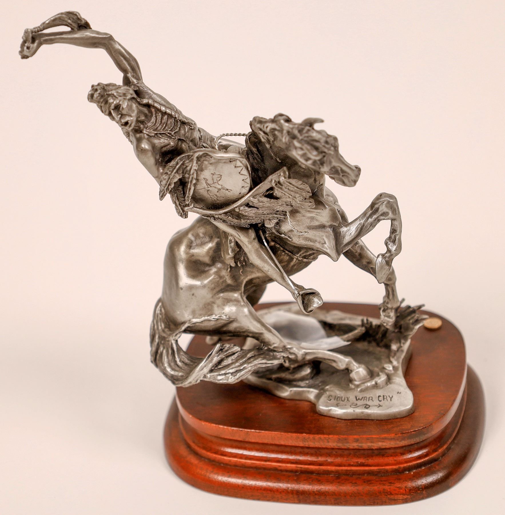 Chilmark produced the Legacy of Courage Collection Honoring the American Indian including this Michael Boyett pewter sculpture titled Sioux War Cry. It is 4-1/2 x 3-3/4 x 8-1/2 inches on wooden base. The warrior's battle club has come free from his upraised hand, and the piece has been attached to the base. This can easily be repaired by a silversmith. This item is numbered 910 of 2500 and includes the Certificate of Authenticity signed by the sculptor.