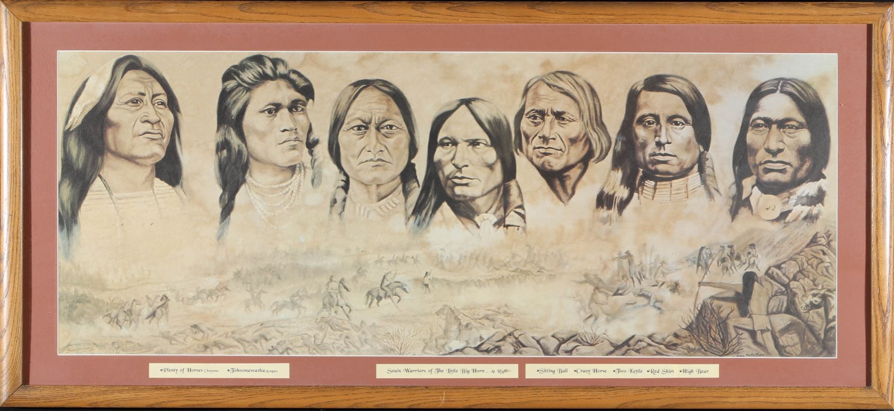 Framed matted charcoal print of Plenty of Horses, Tooboonawasha, Sitting Bull, Crazy Horse, Two Kettle, Red Shirt and High Bear by Dona McPhillips. Frame 18.5x40", print 13.5x35".