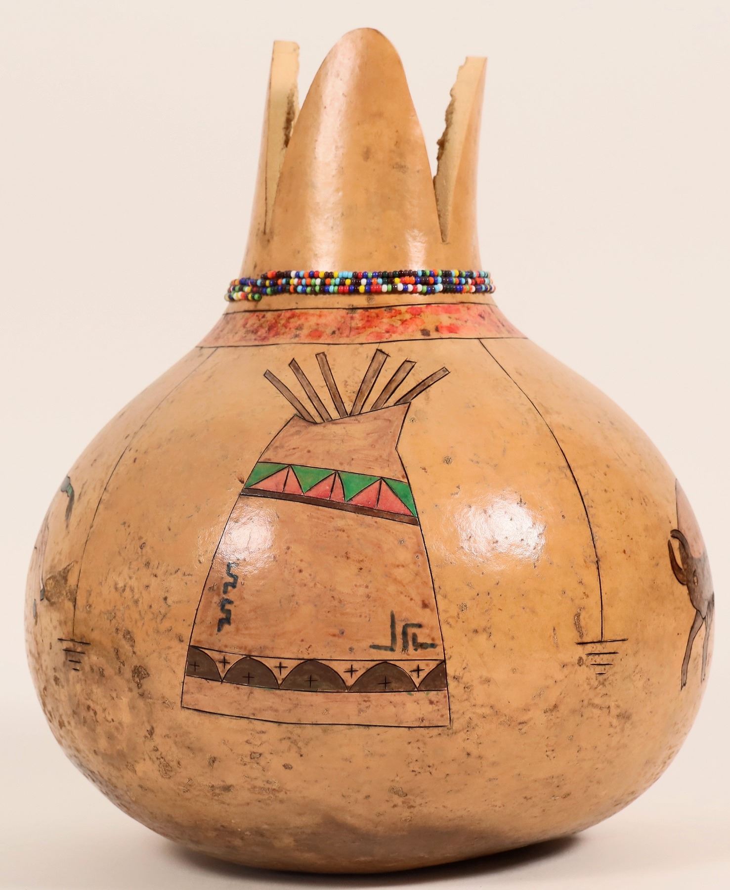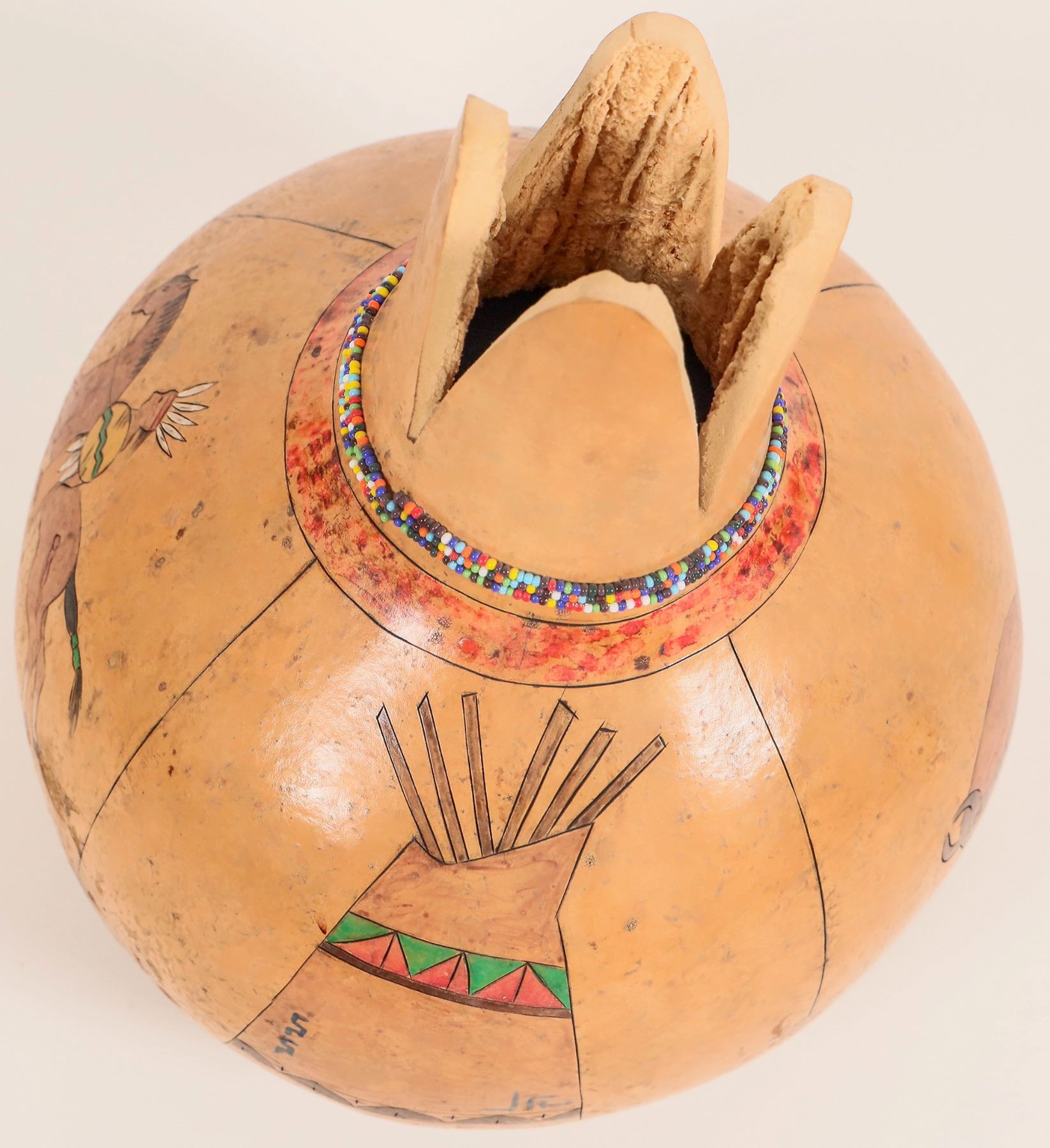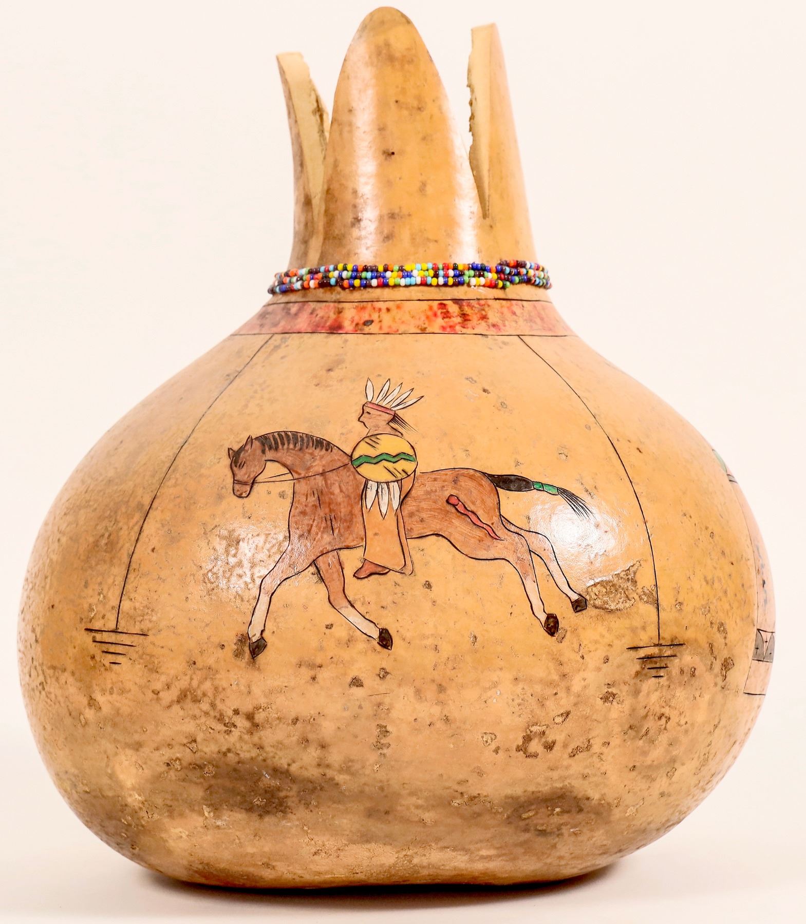 Hand painted, carved and beaded gourd by Ed Sipainich. Ledger style painted images of buffalo, hunter, teepee, horse and rider... great condition