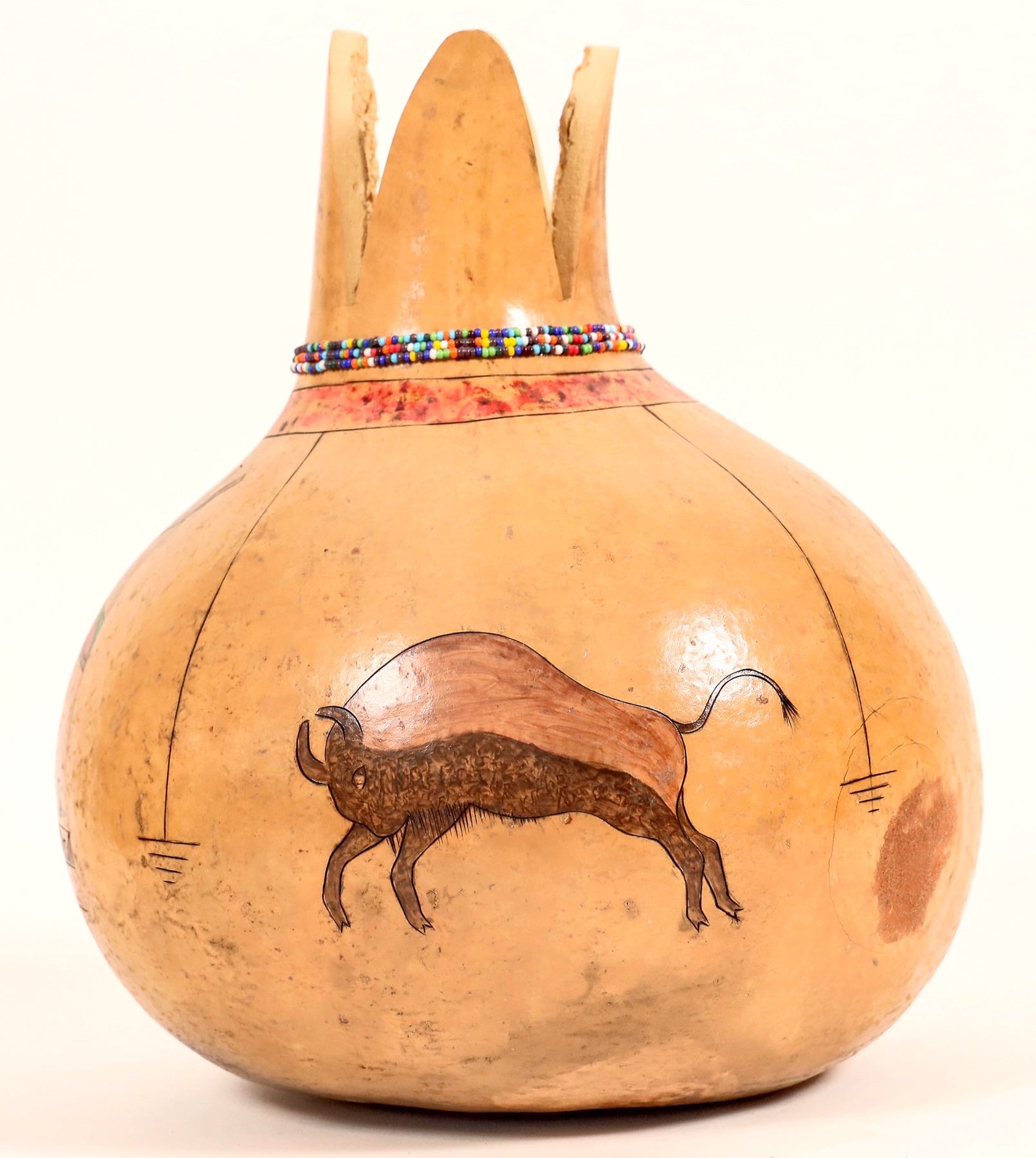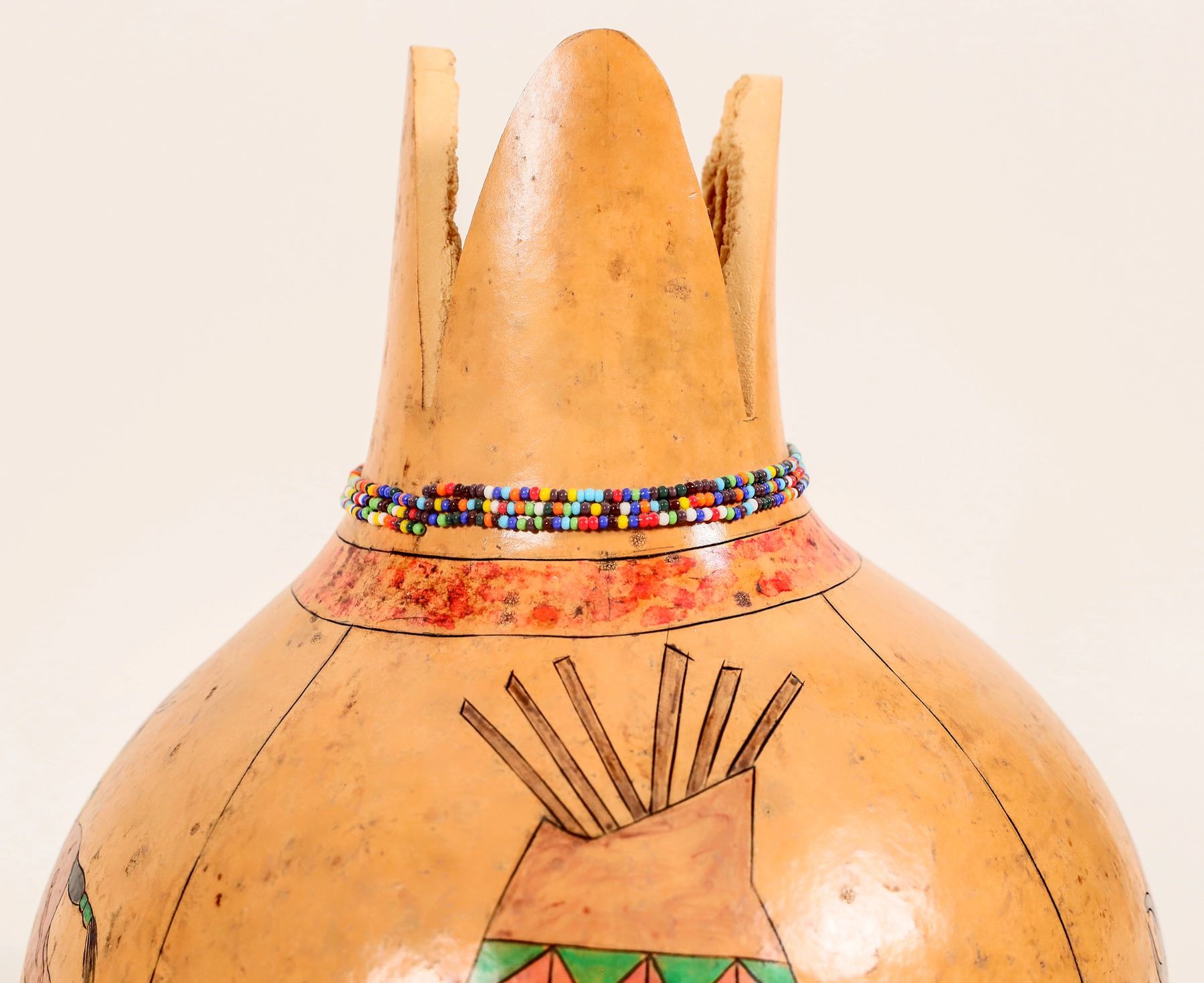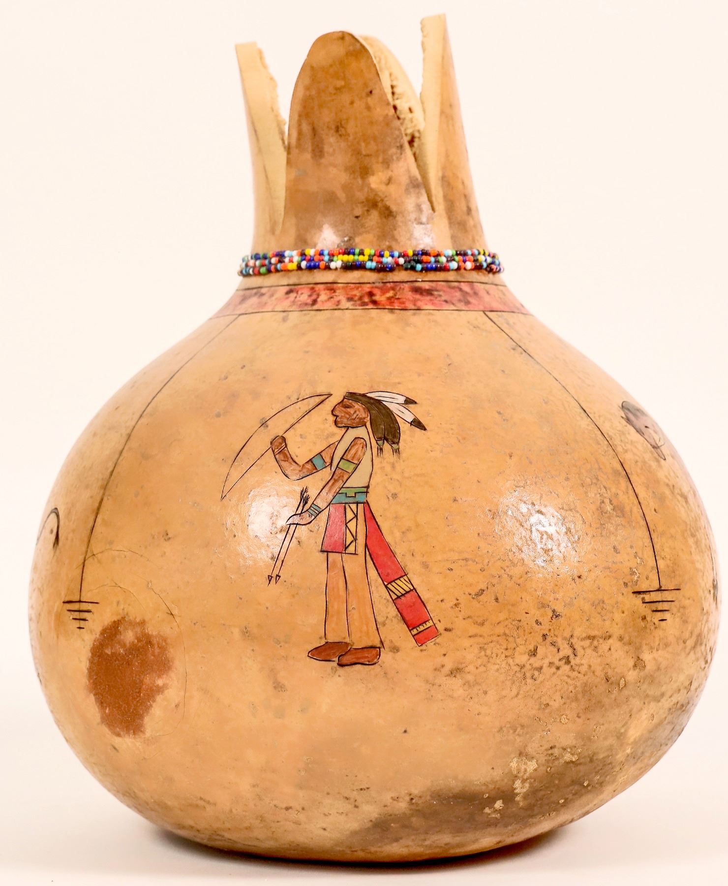 Hand painted, carved and beaded gourd by Ed Sipainich. Ledger style painted images of buffalo, hunter, teepee, horse and rider... great condition