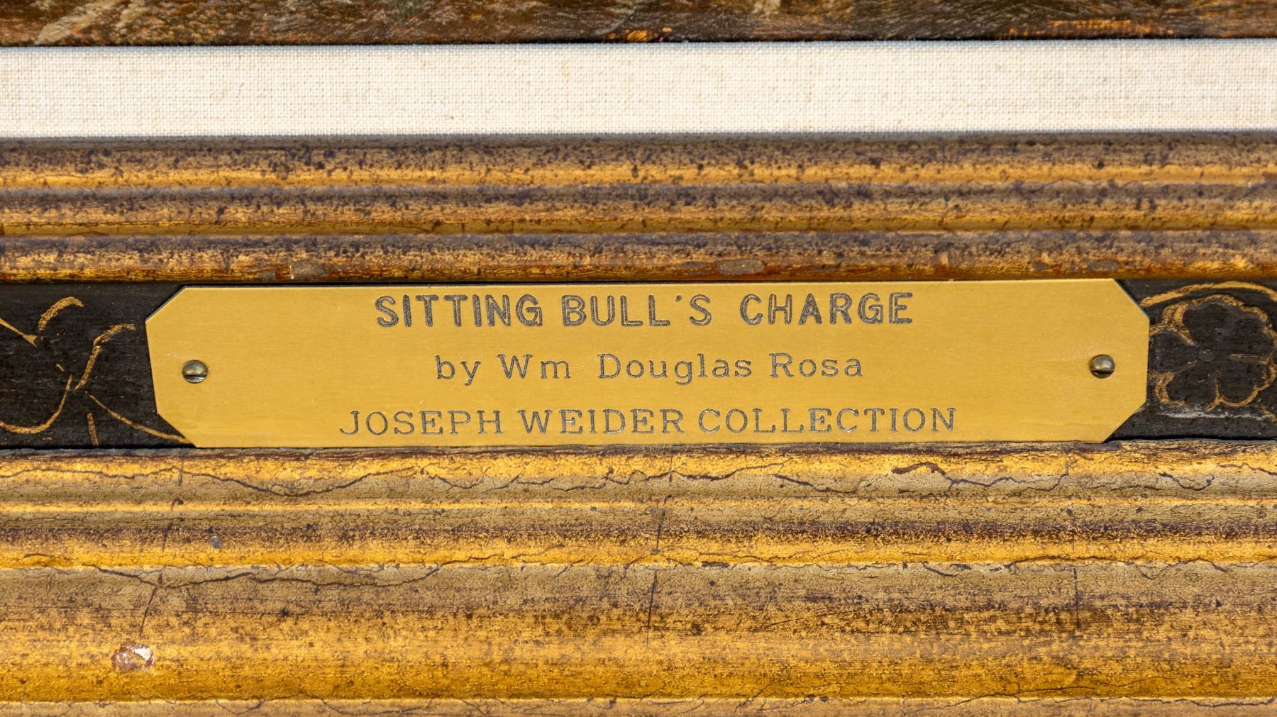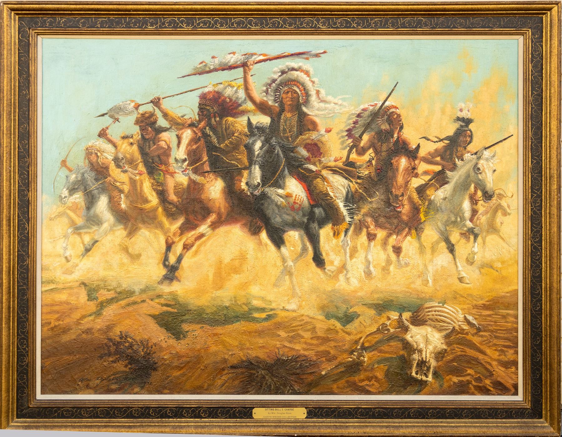 Beautifully painted image of Sitting Bull charging. Cow skull in foreground. Framed 50" x 62", canvas 42" x 54". Painting specifically made for Joseph Weider Collection.