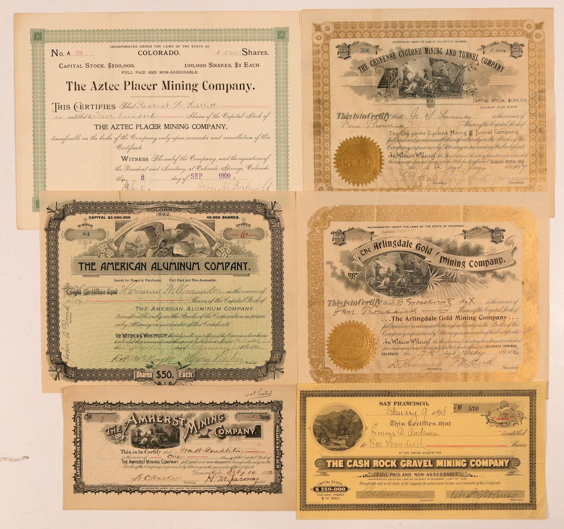 Lot of six different including a Number 1 issued. These could not be located in our Colorado resources including C&L, Hills, CDNC, newspapers.com, or the 1898 CO Mining Directory. Included: Amherst Mining Company (1892, Denver, stock NUMBER ONE, not cxl, mining vignette); Cash Rock Gravel Mining Company (1898, not cxl, mining vignette); Arlingdale Gold Mining Company (1896, Colorado Springs, not cxl, mining vignette); Cheyenne Cyclone Mining & Tunnel Company (1897, Colorado Springs, not cxl, mining vignette); American Aluminum Company (1892, not cxl, eagle vignette); and the Aztec Placer Mining Company (1899, Colorado Springs, not cxl). Fair to good condition. Ken Prag Collection