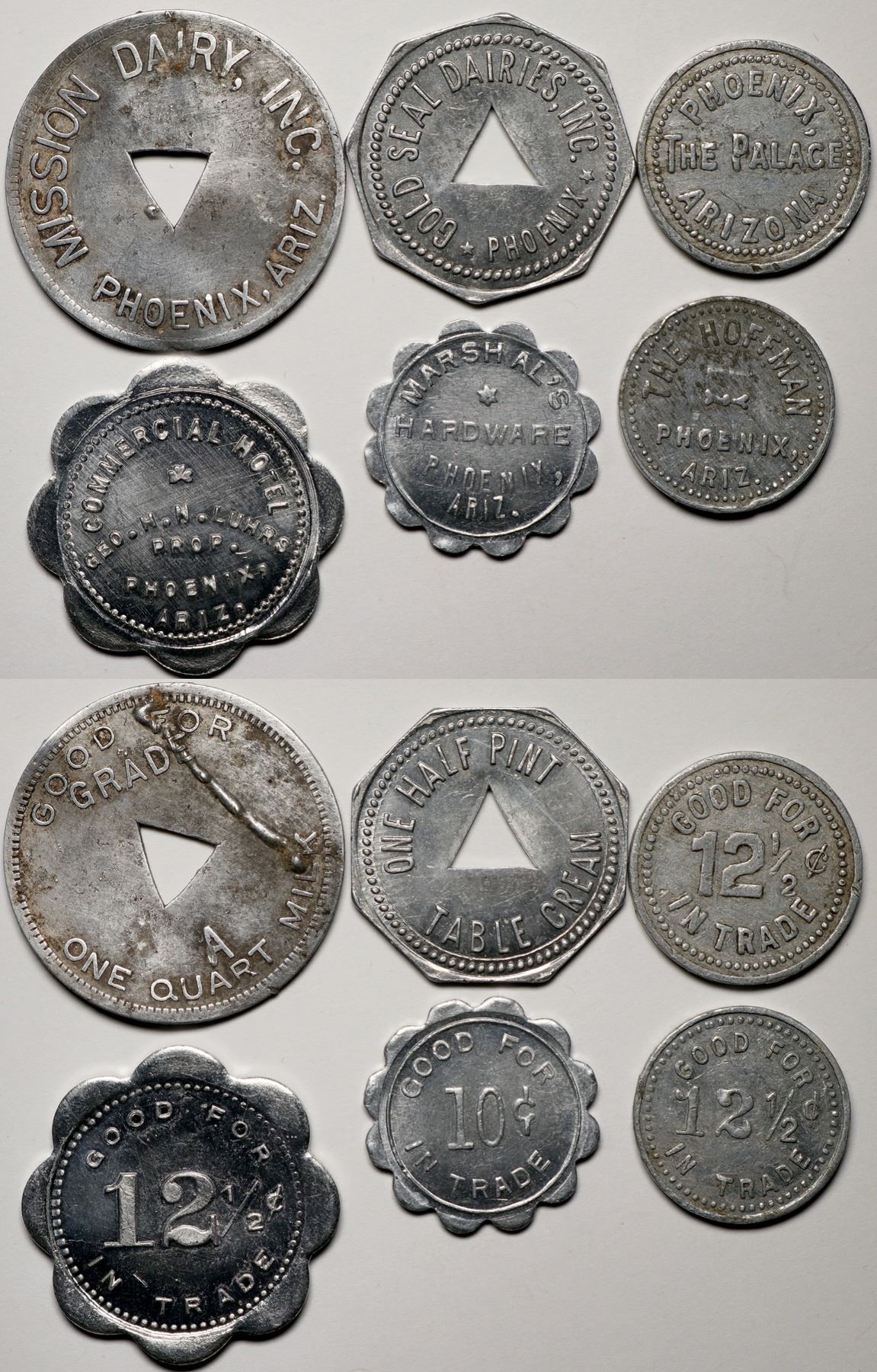Lot of 6. 1) The Hoffman /Phoenix / Ariz. // GF / 12.5c / IT. AL. 20mm. 2) Mission Dairy, Inc./ Phoenix, Ariz. // GF / Grade / A / One Quart Milk. AL, 30mm. Diamond Punch Out. 3) Phoenix / The Palace / Arizona // GF / 12.5c / IT. AL, 20mm. 4) Gold Seal Dairies Inc./ Phoenix // One Half Pint / Table Cream. Oct., AL, 26mm. Diamond Punch Out. 5) Marshal's/Hardware/ Phoenix, / Ariz. // GF / 10c/ IT. AL, Scallop, 20mm. 6) Commercial Hotel/Geo. H.N. Luhrs/Prop./ Phoenix, / Ariz. // GF 12.5c / It. AL, Scallop, 25mm.
